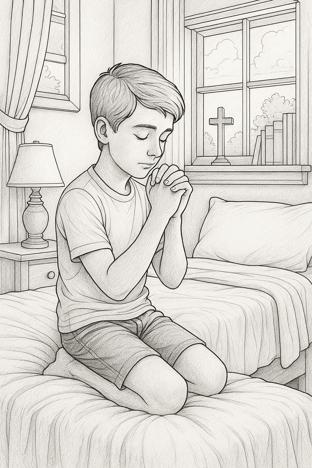 🙏🖍️ Christian Prayer Coloring Page – Boy Kneeling at Bedside – Faith-Based Printable for Homeschool, Devotion & Ministry – Quiet Time Reflection Sheet
