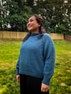 Beige & green Helices are pictured in size 2 on a bust size of 33” (8” of positive ease). Beige version is knit in Rauma Finullgarn in the colorway 452 “light beige”. Kelly green version is knit in Tynn Peer Gynt from Sandnes Garn in the colorway “jelly bean green”. The blue version is pictured on my lovely tester, Jeane, in a size 5, and is knit in Kelbourne Woolens Scout in the colorway “ocean heather”.