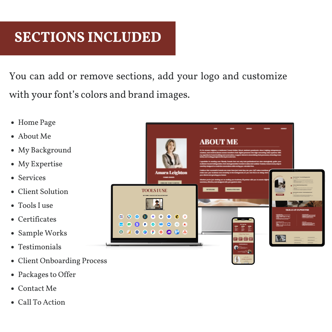 🔹 Pages: Home, About, Education, Work Experience, Services, Skills & Expertise, Tools, Work Samples, Packages, Certifications, Onboarding Process, Testimonials, Client Solution, Contact CTA.