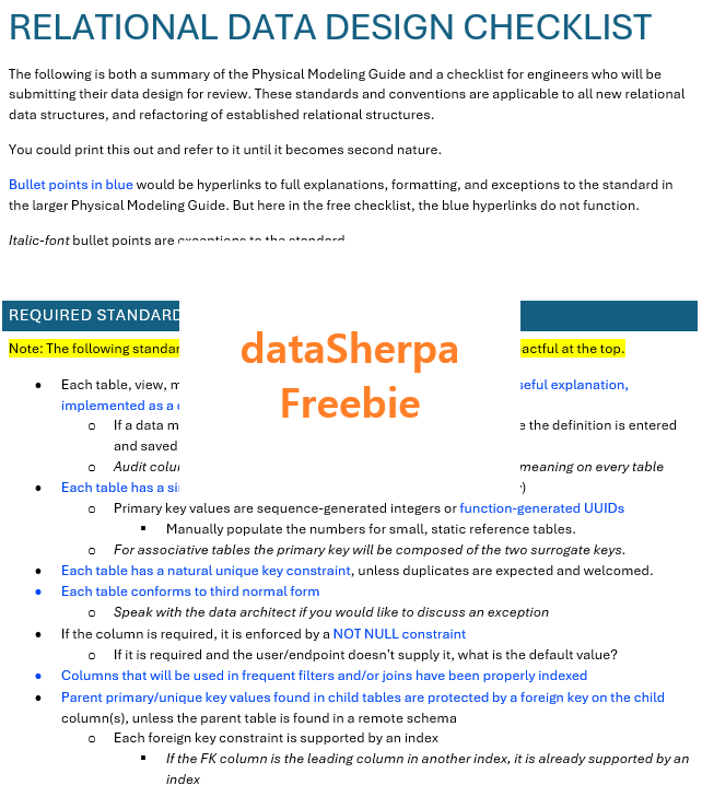 Free relational database design checklist. The main standards in the checklist are just one page, with additional design considerations and questions taking another two pages. The checklist covers things that should be considered before declaring a new table design complete and ready for testing.