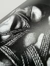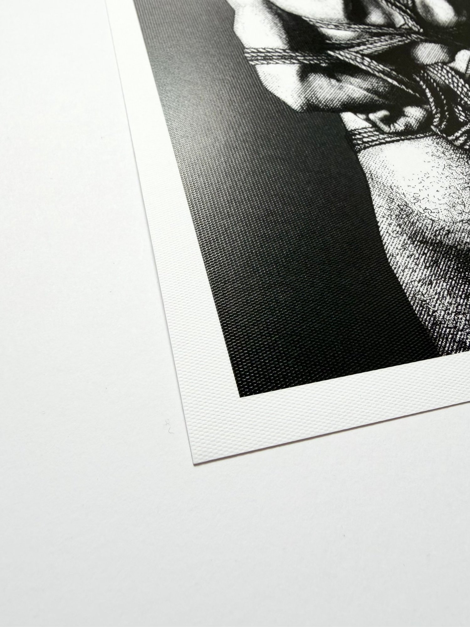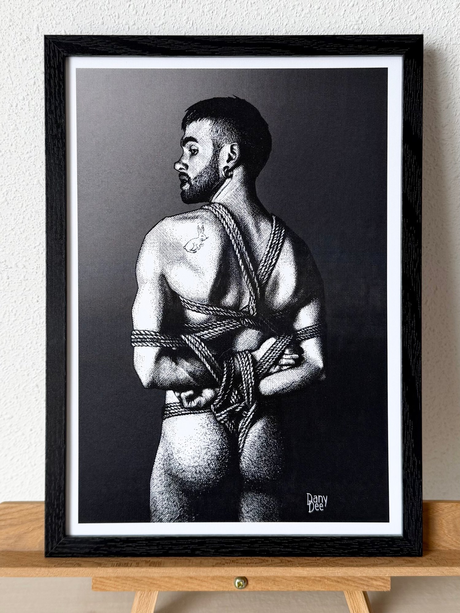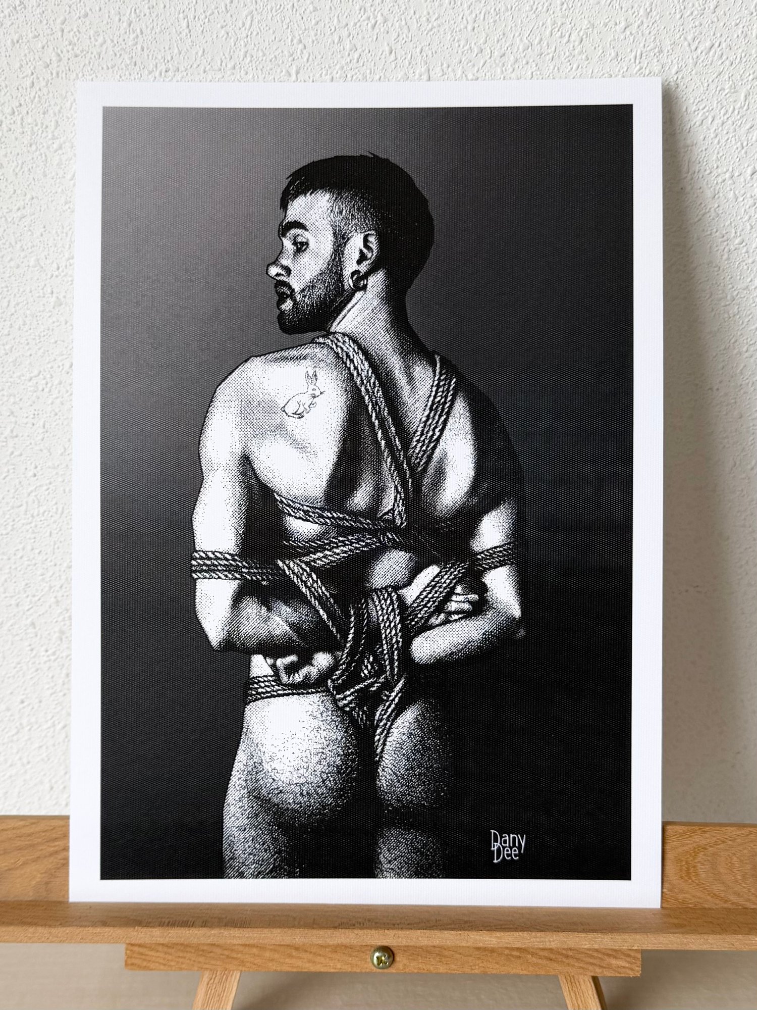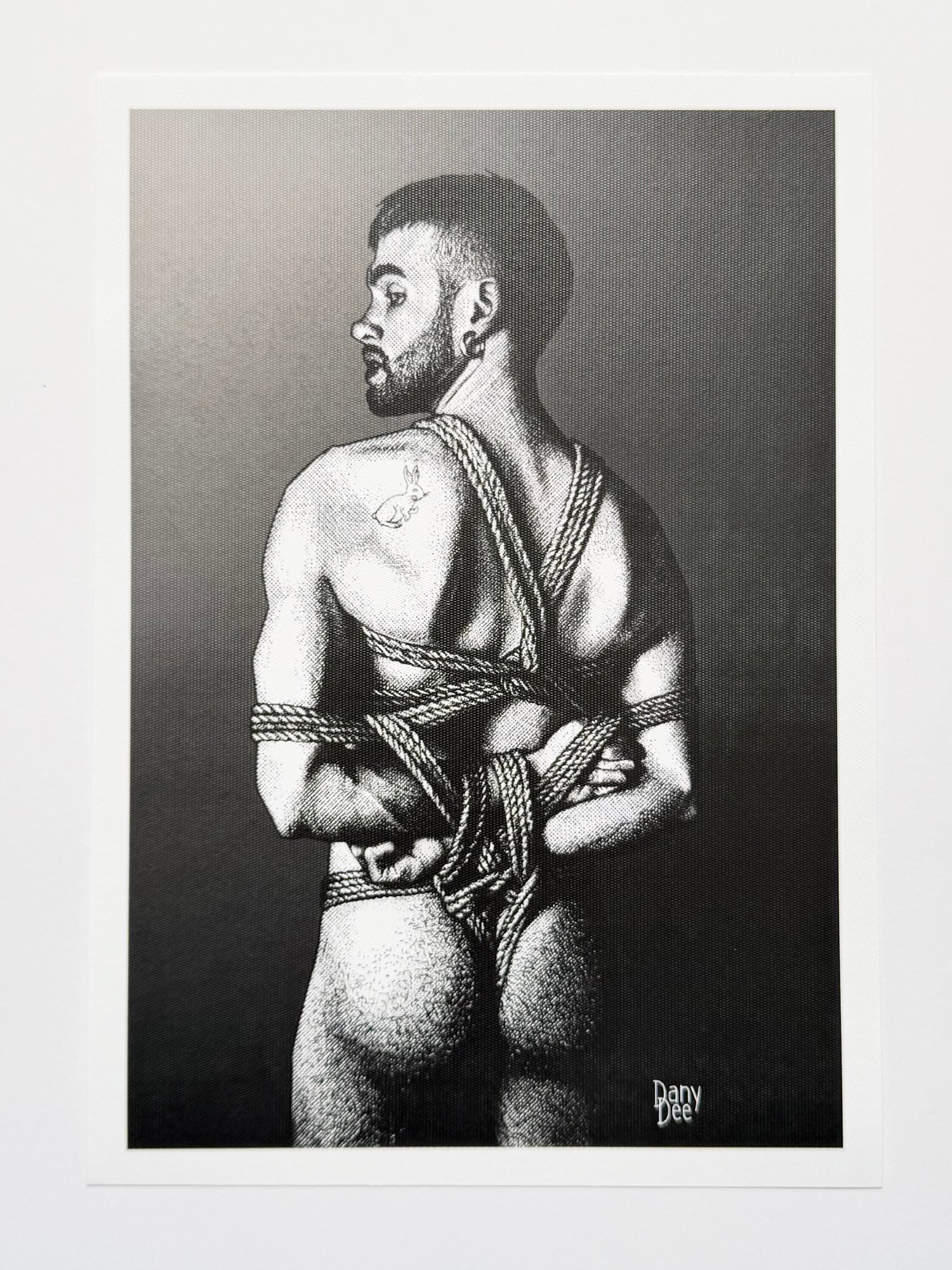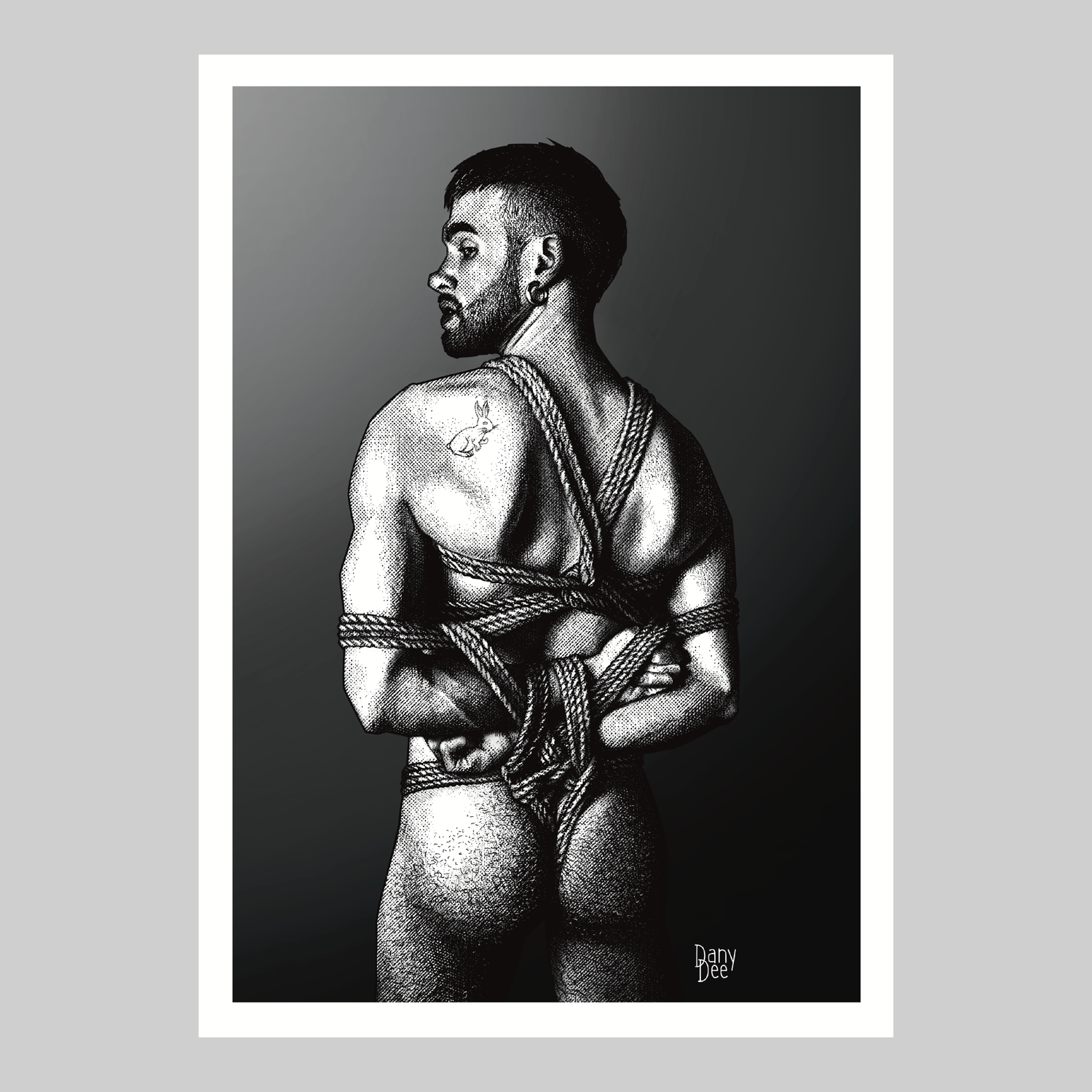 "The White Rabbit" is a hand-drawn, monochromatic A4 art print celebrating shibari bondage culture — a homoerotic illustration of a young bearded man in an intricate rope harness, glancing back over his shoulder, perfect for gay bondage art collectors or queer home decor.
