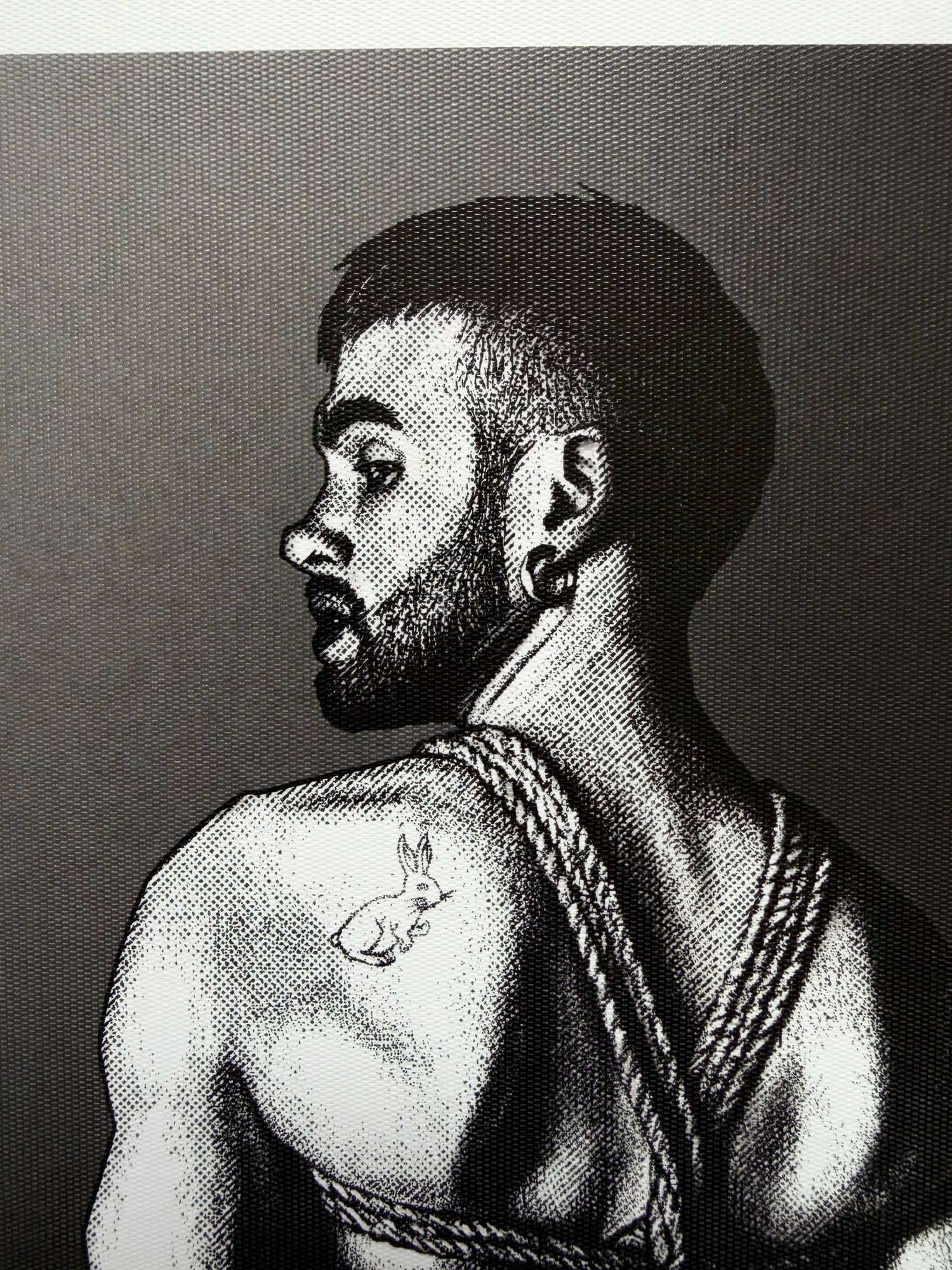A young, bearded guy wrapped in thick rope — arms pinned behind his back, body exposed, eyes meeting yours just enough to make you wonder who’s really in control. On his shoulder blade, a small white rabbit tattoo. Quiet. Almost tender.