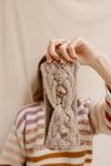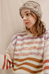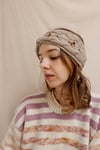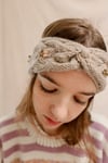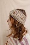The Fiona Flower Headband is a quick and simple knitting project, perfect for scrap yarn. First stitches are cast on after which we start working a lace & cable pattern. When the headband is the right length these stitches are bound off. Then, the beginning and front are sewn together to create the twist detail. Lastly, flowers are embroidered on top using scrap yarn.