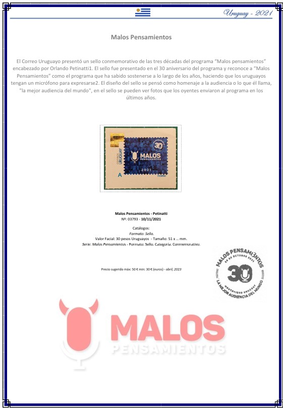 Ficha digital en PDF correspondiente al sello emitido en Uruguay en 2021, perteneciente a la serie “Malos Pensamientos”. Esta ficha está identificada con el número de catálogo Sooluciones UY‑2021‑03793, garantizando una referencia única dentro de mi archivo personal.