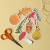 When printed, the leaves and fruit illustrations will each measure between 6.5 and 10.5cm tall (approximately 2 1/4 - 4 inches). For reference, the orange slice is the smallest piece and the fern leaf is the longest.