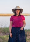 Pine Creek Crop is knit seamlessly from the top down. The yoke is cast on and short rows are worked to raise the back of the neck for a comfortable fit. The yoke lace is knit, then the body and sleeves are separated and worked from the top down. The only finishing is to pick up the stitches at the neck and work the neckline.