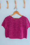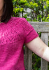Pine Creek Crop features a striking lace yoke, knit from the top down in fingering weight yarn. Short sleeves and twisted rib details finish off this sweet summer top.