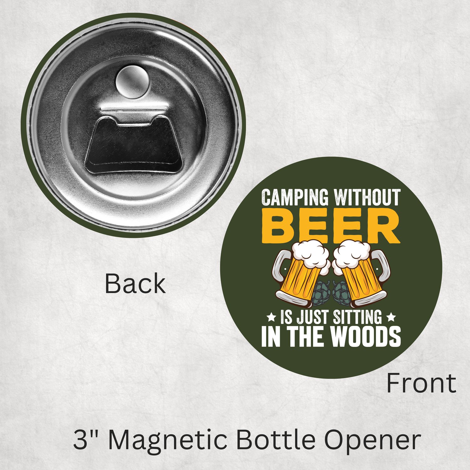 Bottle Opener Magnet is 3" round. Imaged on the front side and on the back side is a magnet and bottle opener. These magnets are great for the kitchen, BBQ area or make excellent gifts.