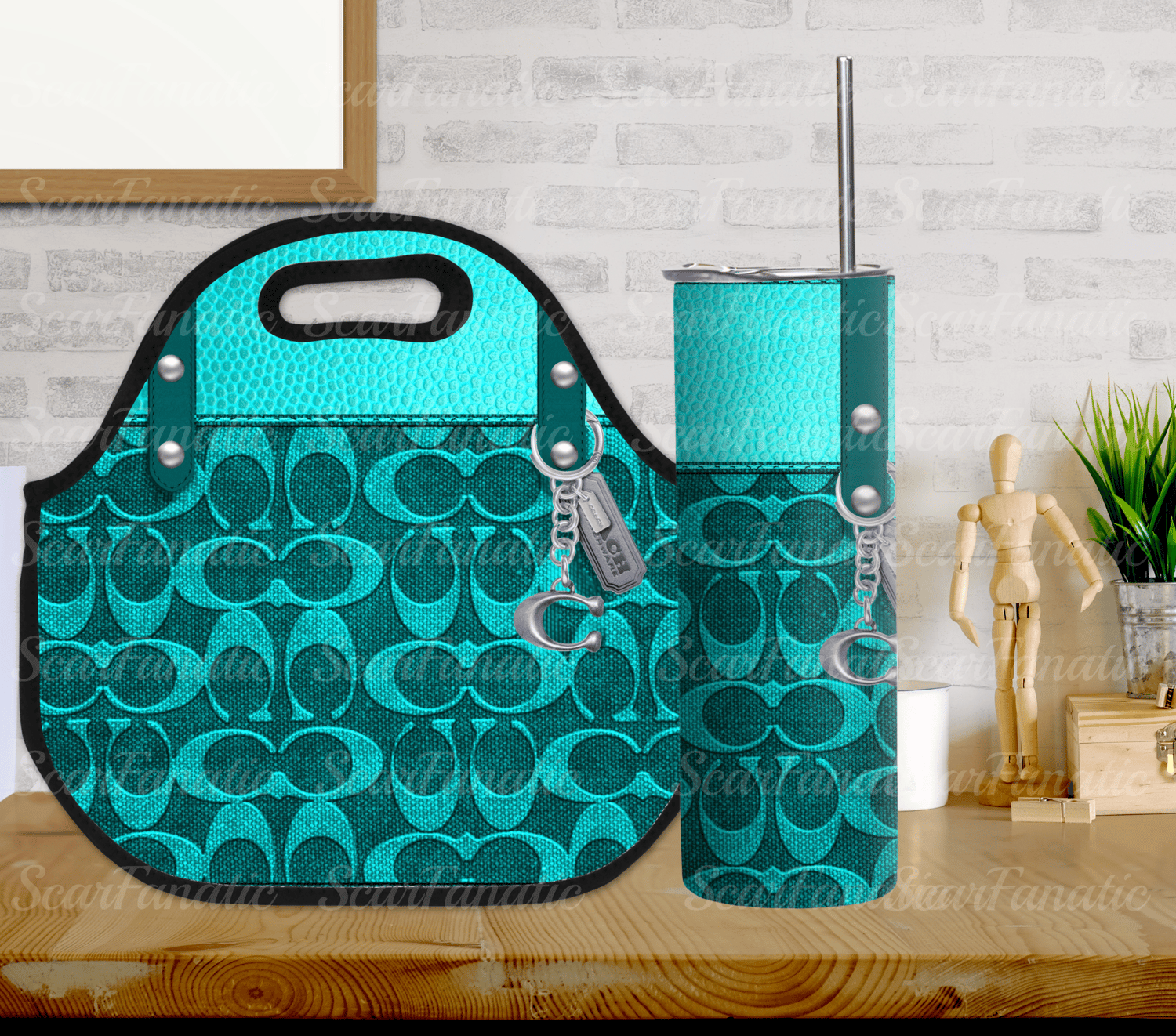Aqua Blue and Silver Denim and Leather Purse Look 20oz Skinny Tumbler and Lunch Tote Design Bundle PNG