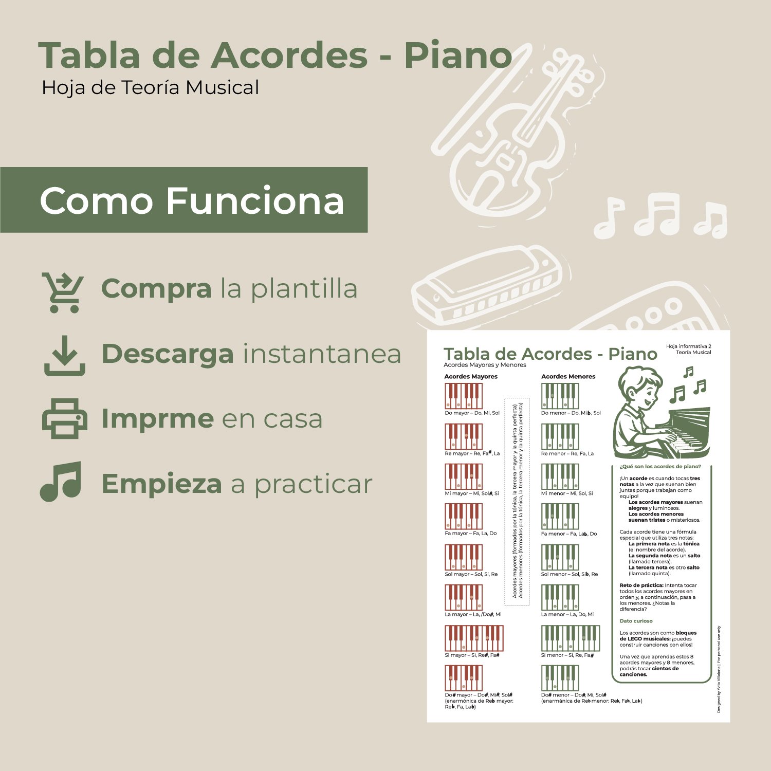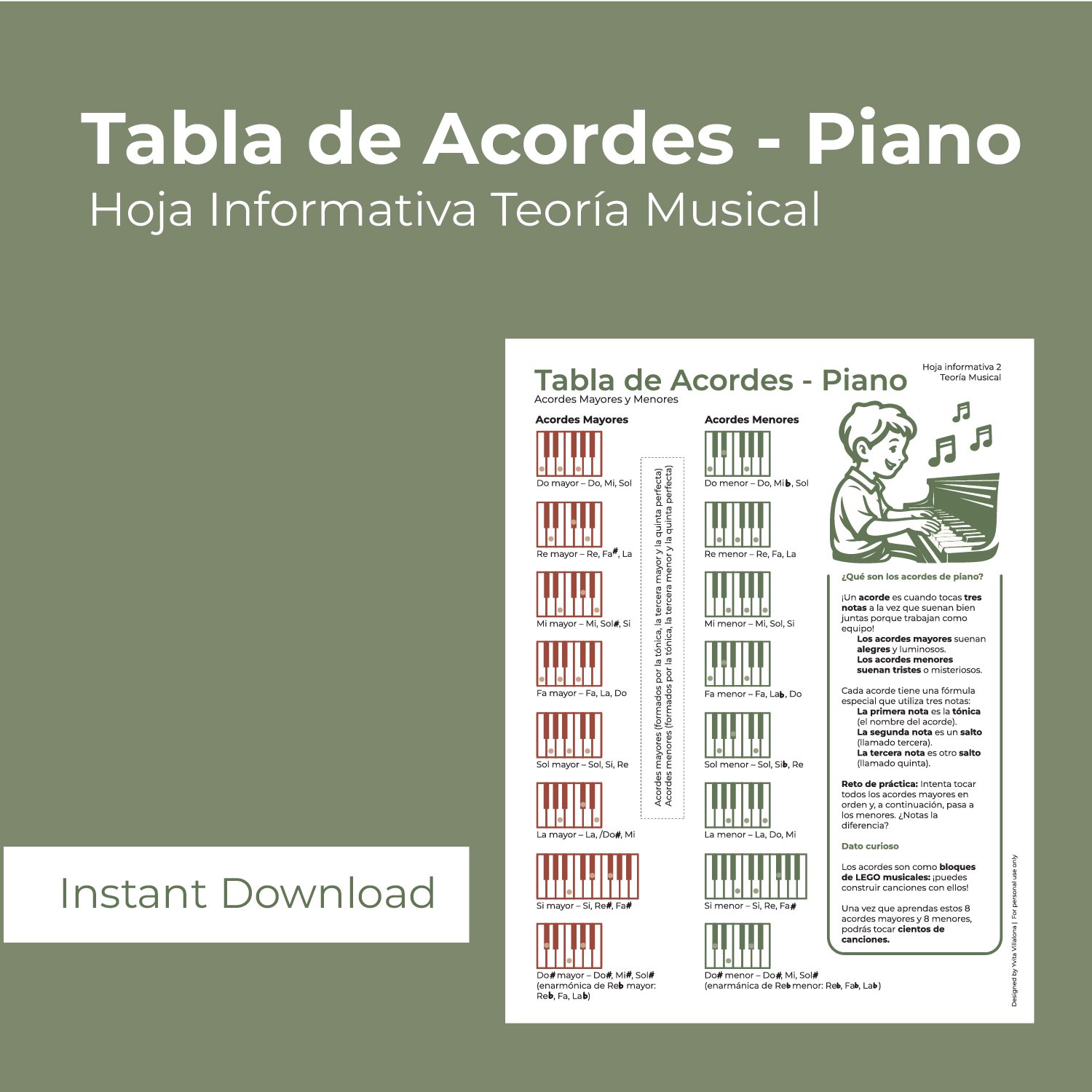 Tabla de Acordes para Piano en Español | Acordes Mayores y Menores | Guía Imprimible para Principiantes | Hoja de Referencia de Piano | Descarga Digital