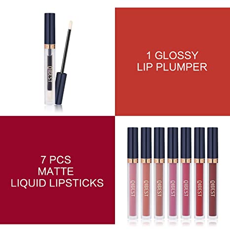 QiBest 7Pcs Matte Liquid Lipstick + 1Pcs Lip Plumper Makeup Set Kit, Pigmented Long Lasting Lip Gloss Set, Velvet Waterproof Lip Makeup Gift Sets for Girls and Women