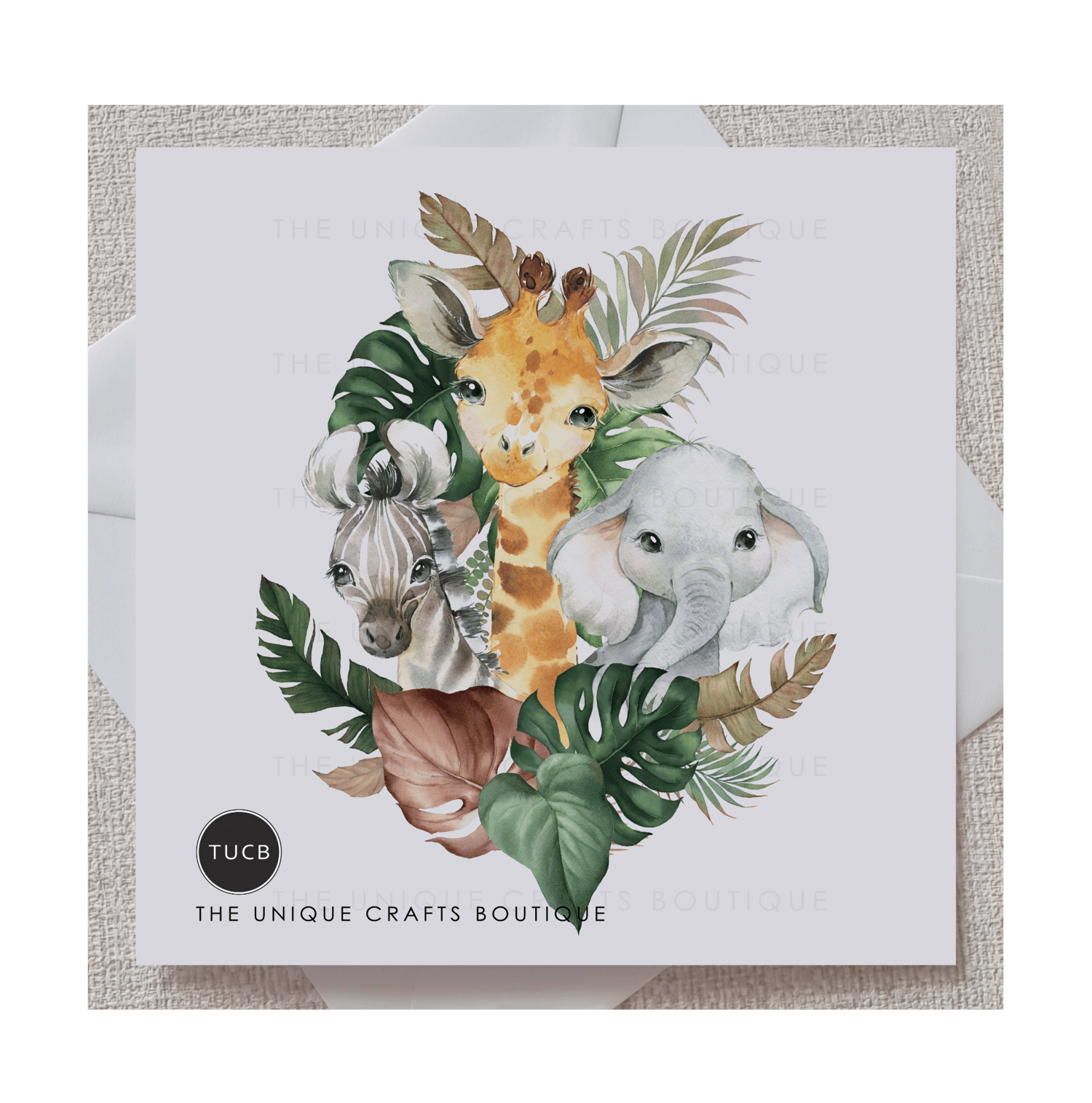This card is perfect for any occasion. Printed with a soft watercolour printed Zebra, Giraffe and Elephant peaking through some leaves. This cute design can be treasured for years to come.