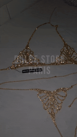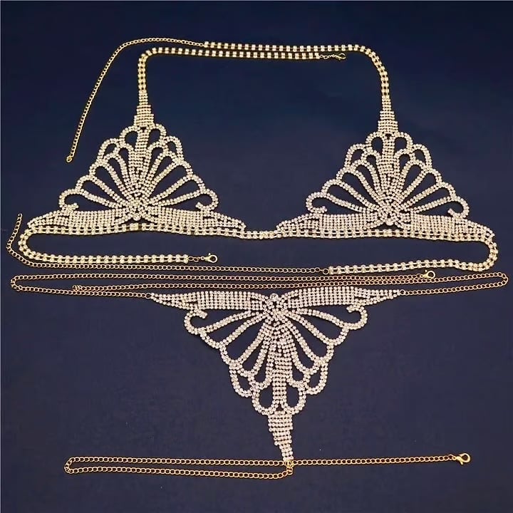 The rhinestone bra offers a striking balance of elegance and daring, framing the body beautifully while enhancing your natural glow. Paired with the matching bottom, the set creates a cohesive, show-stopping silhouette that highlights your curves and celebrates your confidence. Whether styled for a special night, a photoshoot, or simply to feel powerful in your own skin, this set was made to make you feel like pure gold.