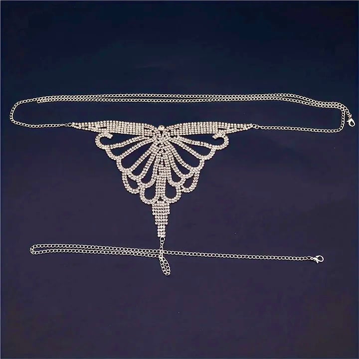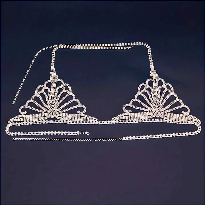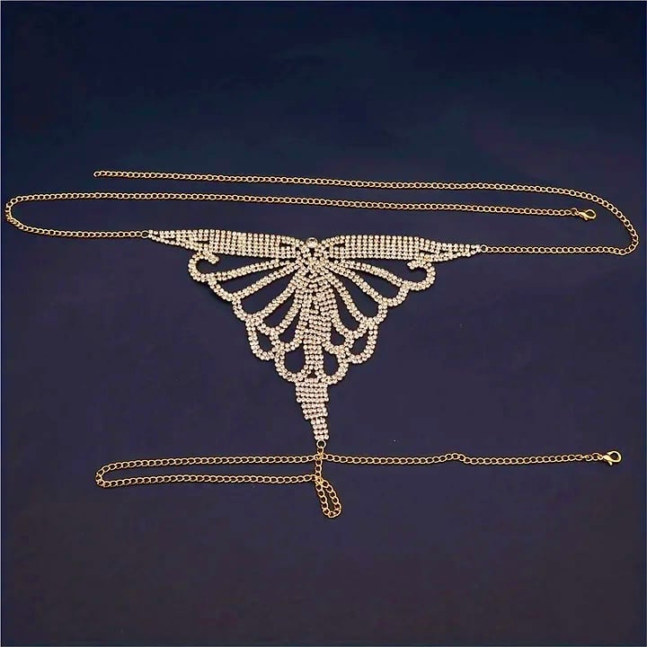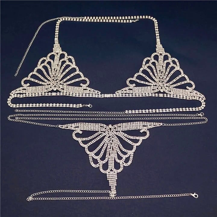 Glistening rhinestones blanket the design, catching and reflecting the light with every step, turn, and pose. Each stone is carefully placed to create a radiant, high-impact sparkle that feels both lavish and seductive. Delicate chain accents weave seamlessly through the piece, adding a bold, sensual edge that elevates the look from glamorous to unforgettable.