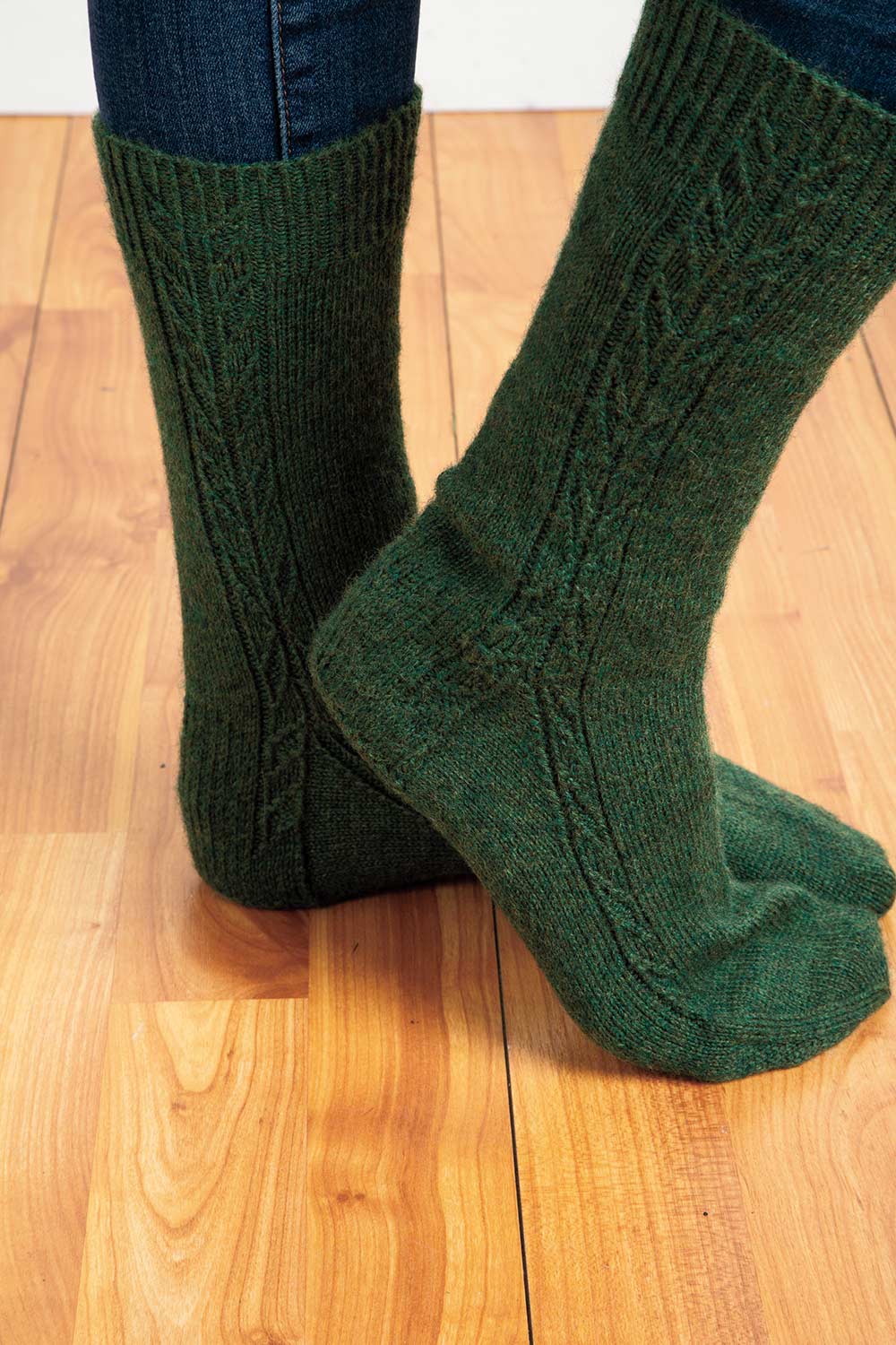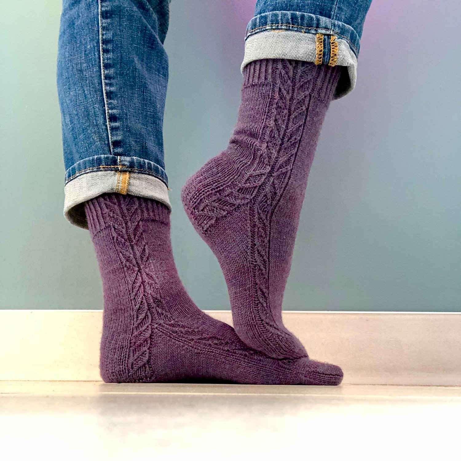 Cardamine’s petal motif emerges from the twisted rib cuff, changing direction above the ankle and then splitting at the heel flap. Seven sizes ensure that these socks can fit anyone from toddler to large adult. The sock is worked from the top down in the round with a round heel. Cardamine stitch pattern instructions are both written and charted.