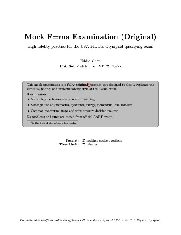 This is a fully original, high-fidelity mock examination designed to closely match the difficulty, pacing, and problem-solving style of the F = ma exam.