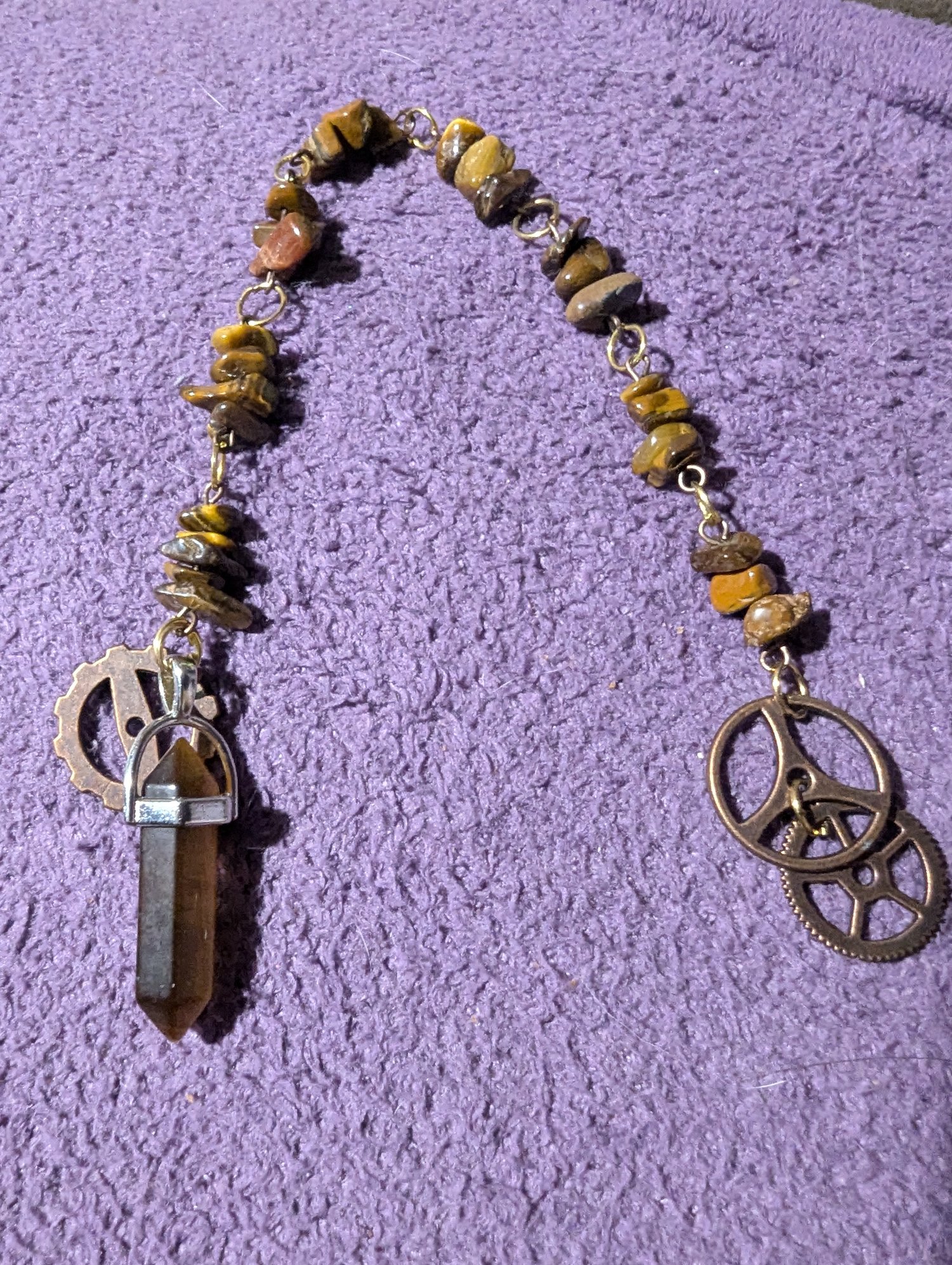 Hand beaded tigers eye stones, with tigers' eye pendant and gear charms. One of a kind. No pattern used. No duplicates created.