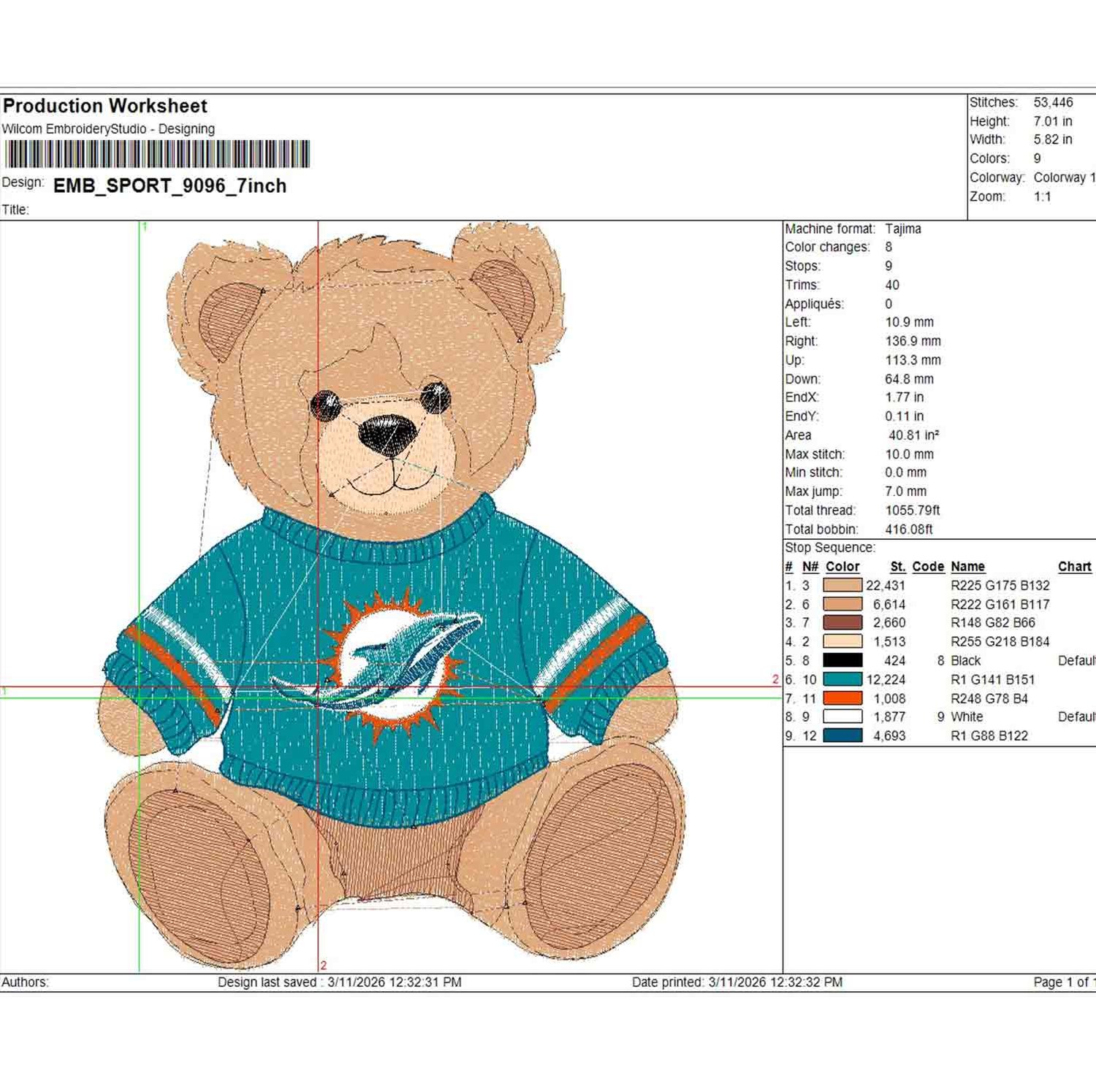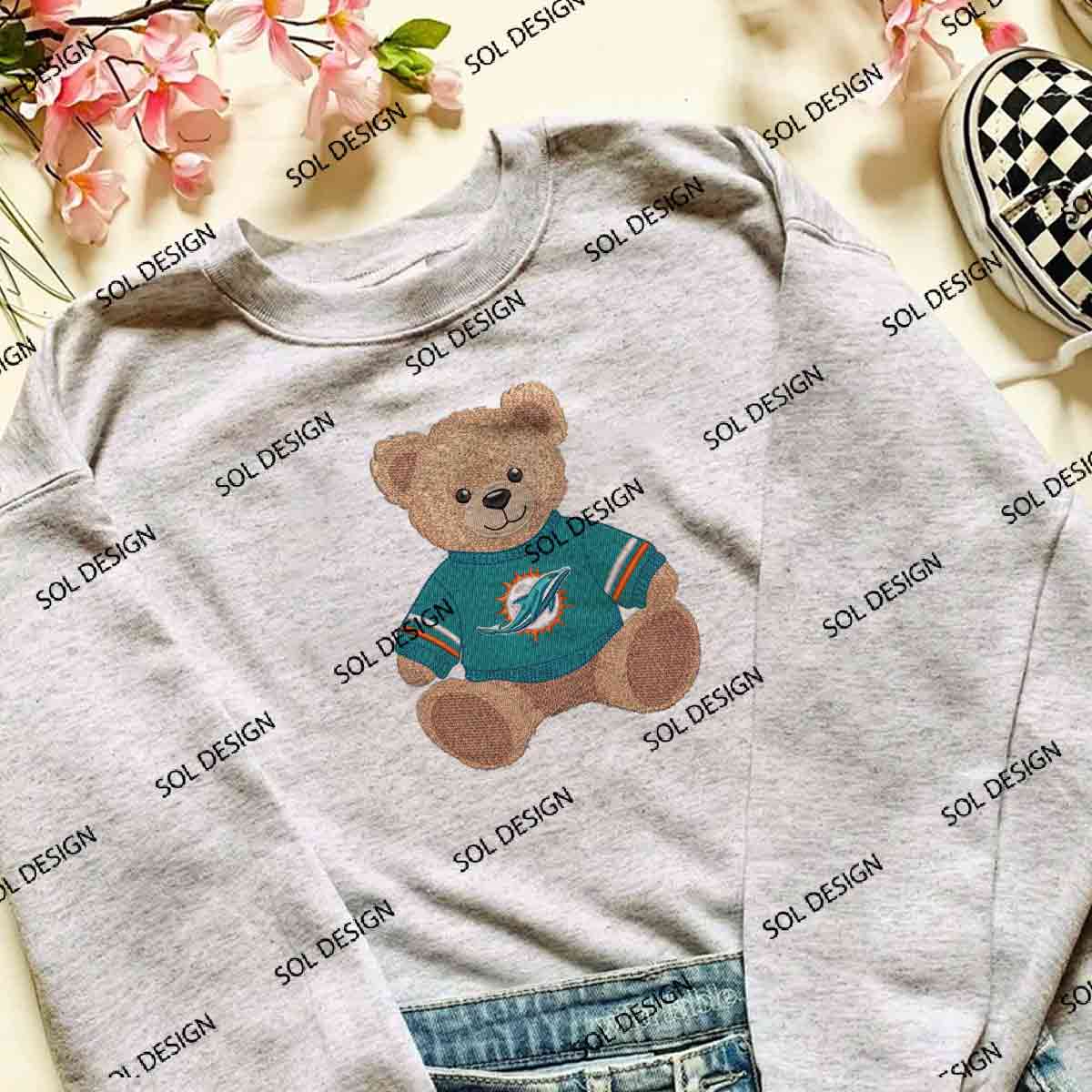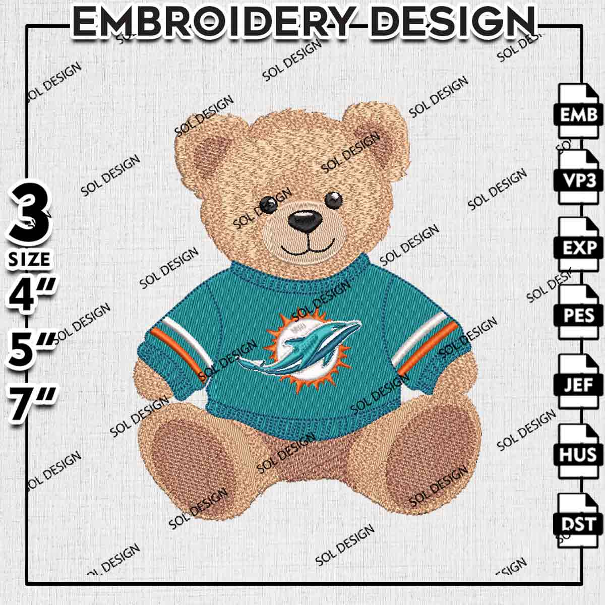 Miami Dolphins Team Teddy Bear Logo Embroidery Designs, NFL Miami Dolphins Embroidery Files, NFL Dolphins Logo Embroidery, National Football League Machine Embroidery Design, Cute Teddy Bear Sport Designs, Digital Do