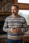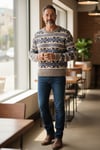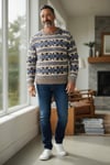 Classic, warm and timeless — this handknitted Nordic-style pullover is the sweater every man needs in his wardrobe. Featuring a traditional snowflake and geometric Fair Isle pattern in a rich palette of steel blue, chocolate brown, cream and oatmeal, it's the perfect companion for cold days by the fireplace, mountain weekends, or simply looking effortlessly stylish.