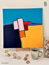 Esta obra en acrílico sobre lienzo (40x40 cm) destaca por su potente equilibrio visual y el uso de bloques de color con marcados perfiles oscuros. La calidez del amarillo y el rosa contrasta con la profundidad del azul marino, creando una pieza contemporánea con mucha fuerza expresiva y textura palpable.