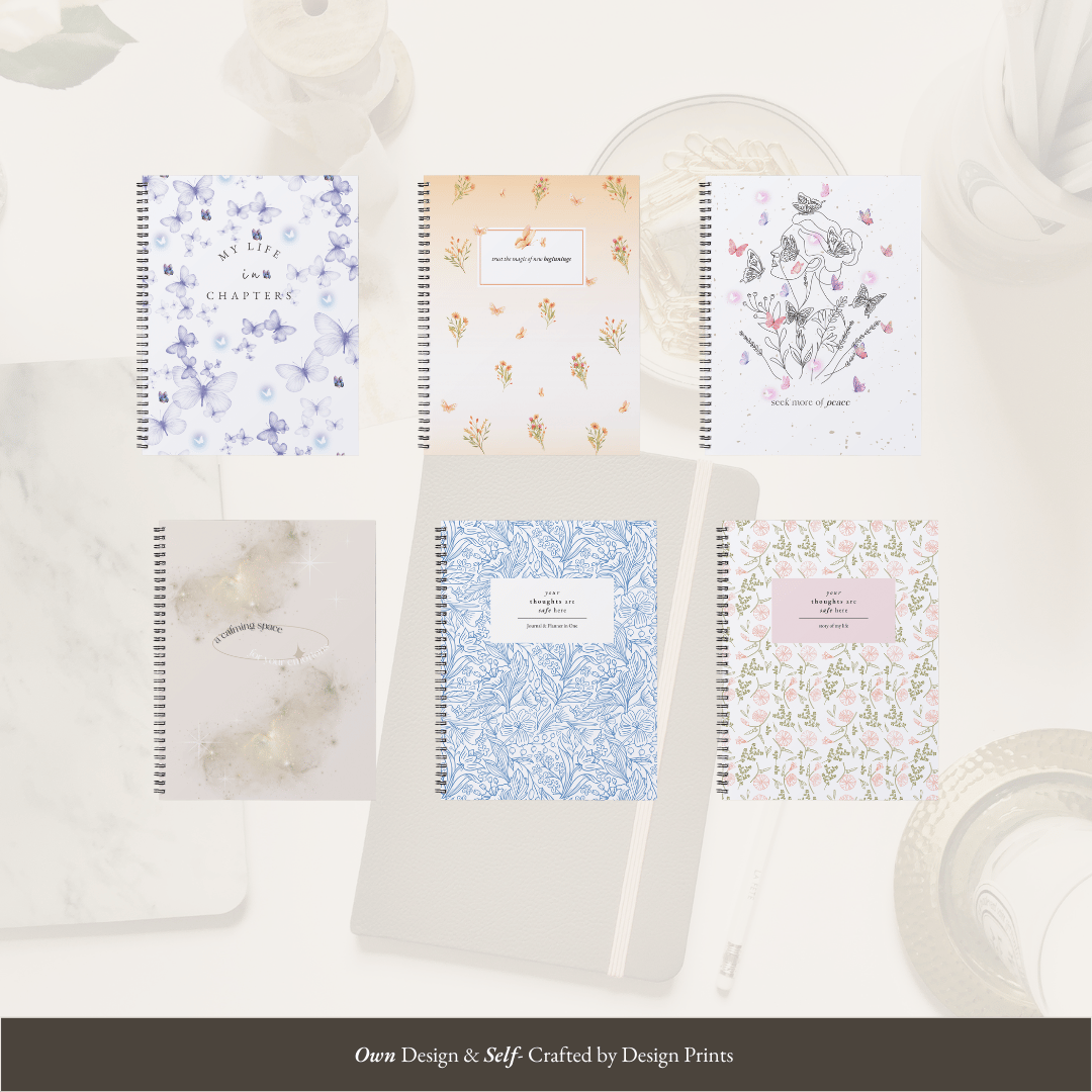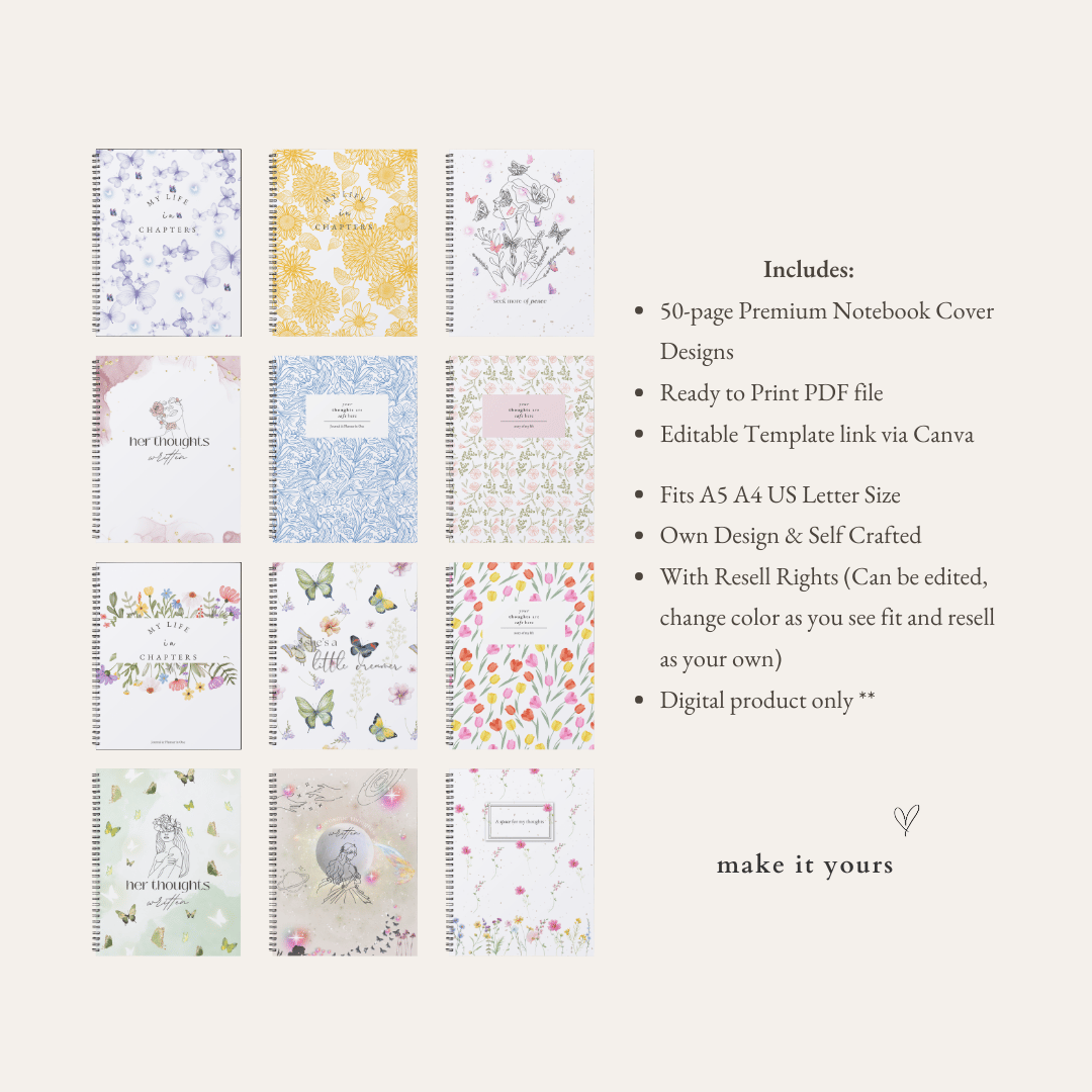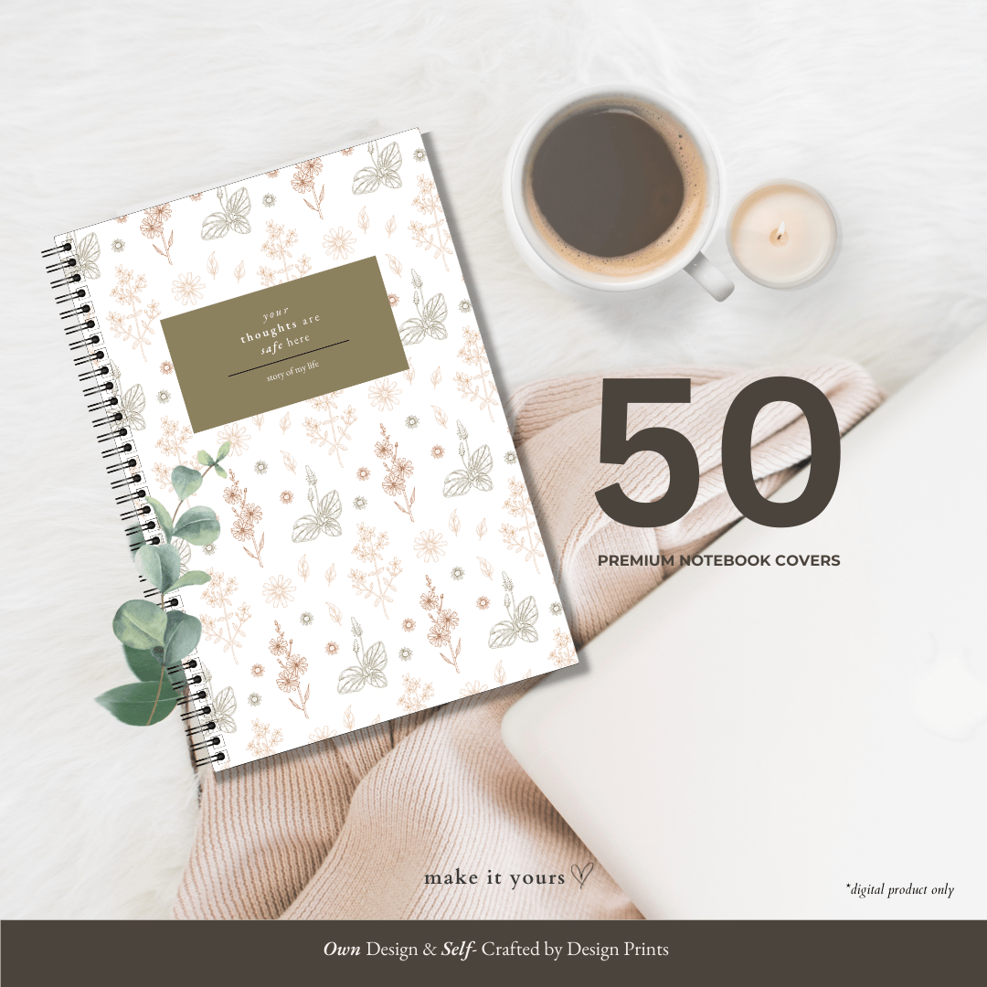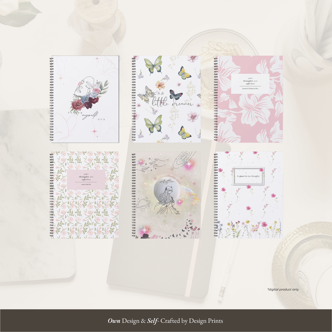 The 50-page Premium Bundle Notebook Covers were created out of pure inspiration and a love for creativity, serving as an outlet for my emotions. They are a delightful mix of cosmic dreams, a mood for spring season, and thoughts inspired by women. Each cover comes with a self-care prompt, so every time you reach for your notebook, you're greeted with a dose of inspiration to write your heart out.