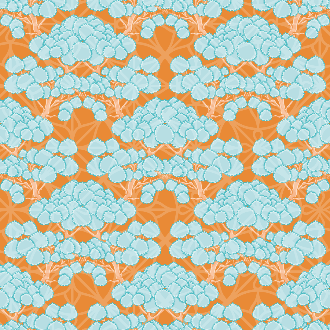 Cute tree vector repeat pattern. Aqua and orange shrub seamless illustration.