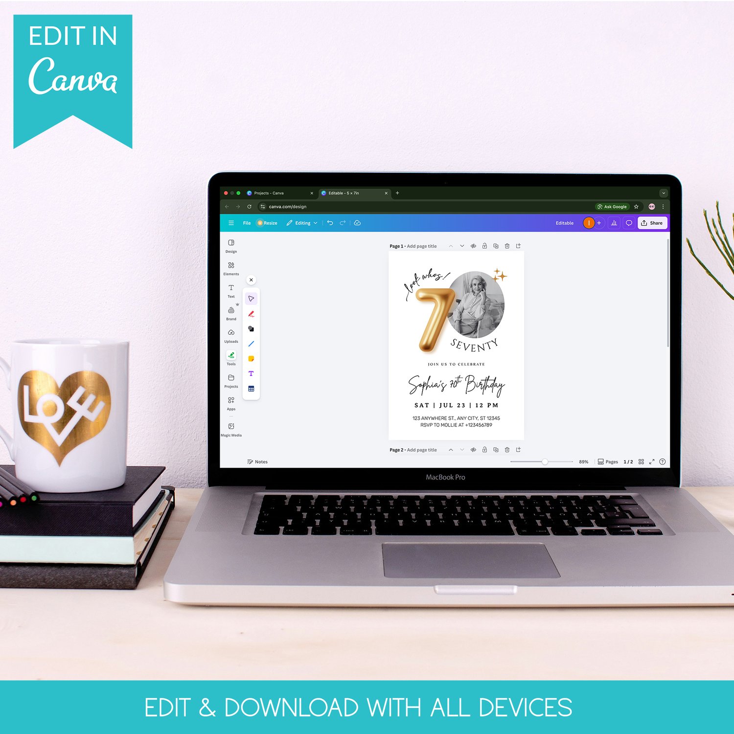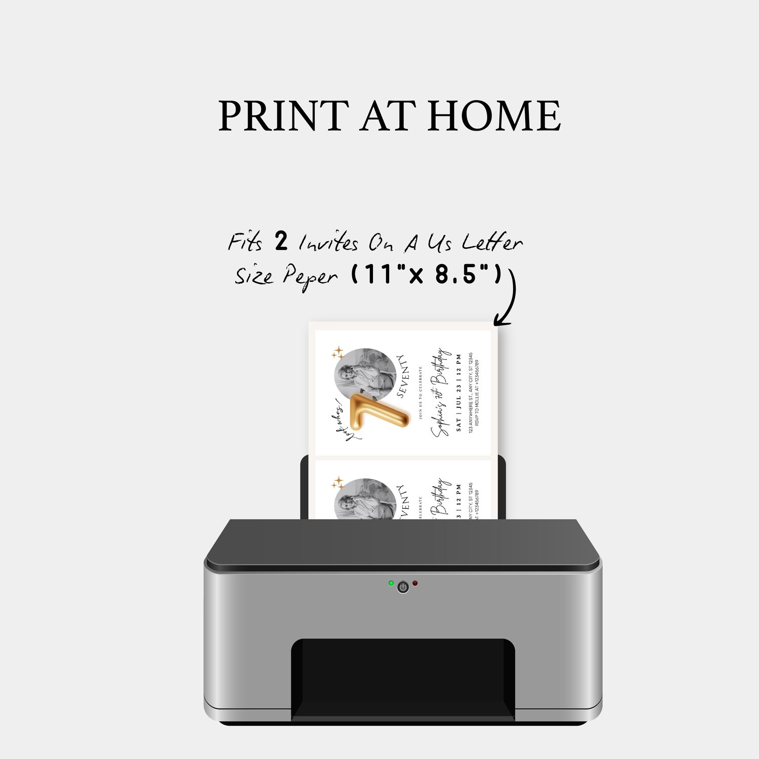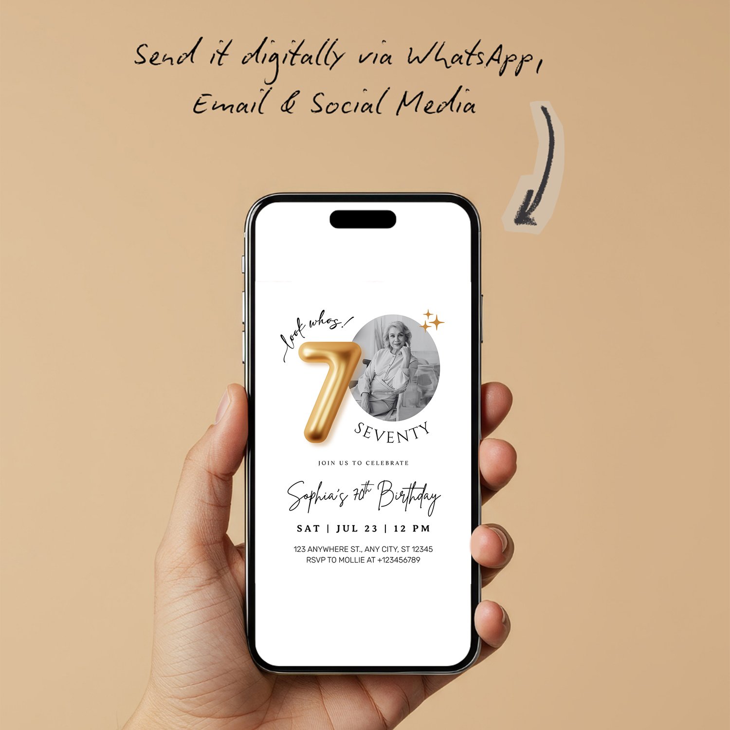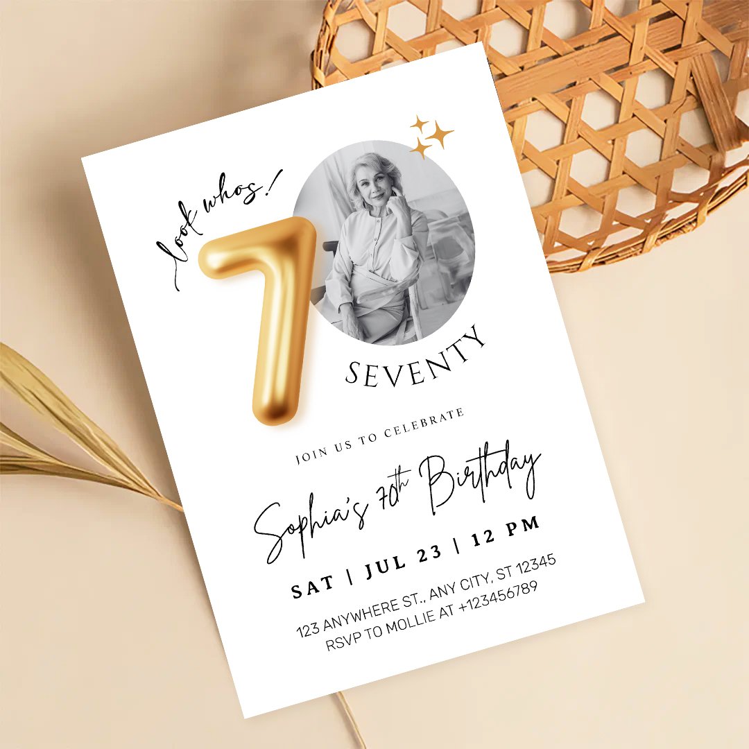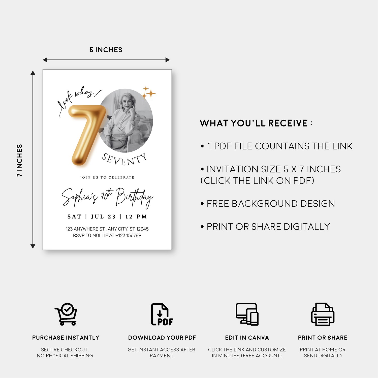 Modern Minimalist 70th Birthday Gold Balloon Photo Invitation Template | Elegant Milestone Party Invite | Editable & Instant Download