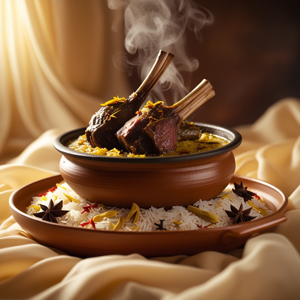 A warm and inviting professional food photography setup featuring Dum Pukht, a slow-cooked lamb dish, presented in a sealed earthen pot, placed atop a bed of aromatic saffron-infused rice, garnished with whole cardamom, star anise, and cloves, against a soft, creamy background that evokes a sense of comfort and luxury, with a hint of warm steam rising from the dish, bathed in warm, golden indoor light, emphasizing the rich flavors and aromas of the traditional Indian cuisine, with a shallow depth of field, blurring the surrounding elements, and drawing the viewer's attention to the tender, slow-cooked lamb, and the delicate arrangement of spices on the rice.