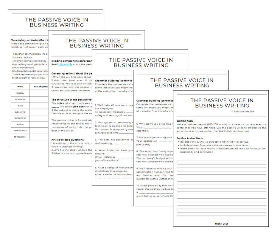 This short lesson will provide your students with a a comprehensive overview of the passive voice in English, address certain attitudes related to overusing passive structures in business writing, and help your learners explore their own writing preferences.