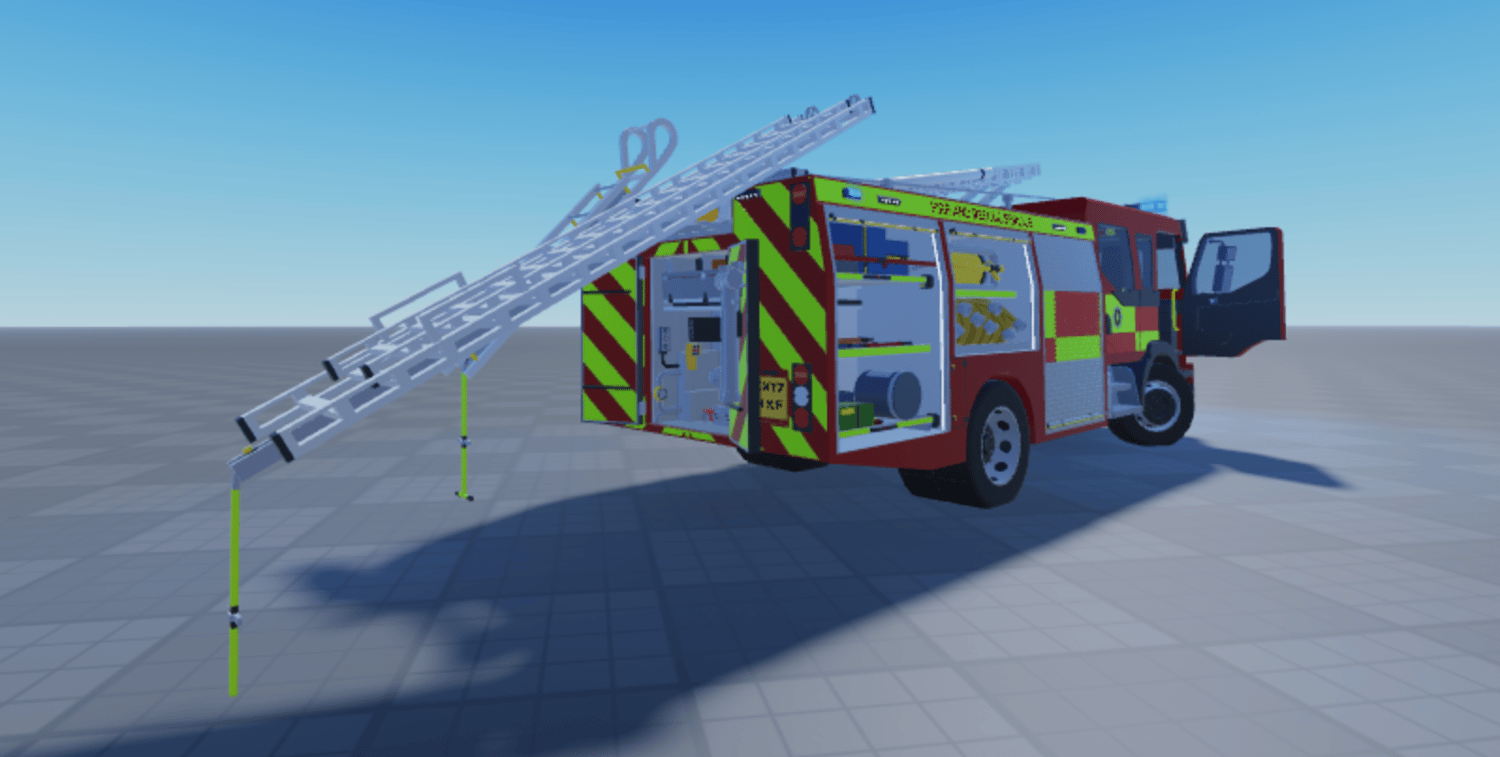 This product includes chassis, ELS, cab interior, locker interior+rear pump door interior, fire tools, scripted drop down ladders, opening rear doors+lockers and animated cab doors.