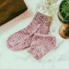 The Clematis socks are knit from the cuff down with a heel flap and gusset. A textured stitch pattern is worked along the cuff. The stitch pattern is both written and charted.