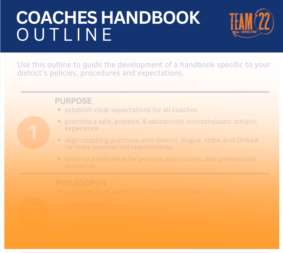 This guide serves as an outline for an Athletic Director to develop a clear, concise handbook specific to your district's policies and procedures. By defining, in writing, the department's purpose and philosophy, professional expectations, and logistics pertaining to practices, games, resources and travel, future challenges that might consume resources and compromise culture can be prevented.