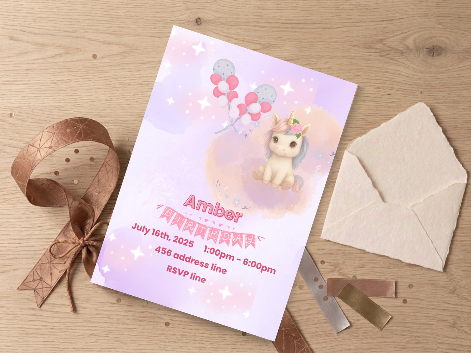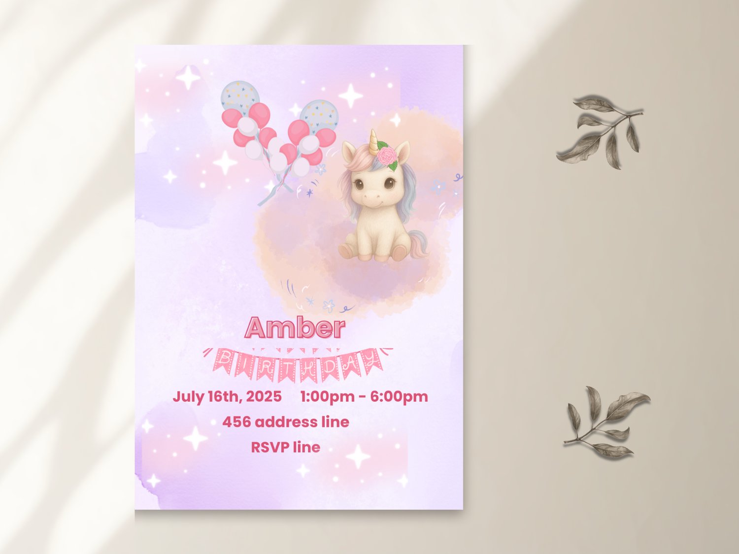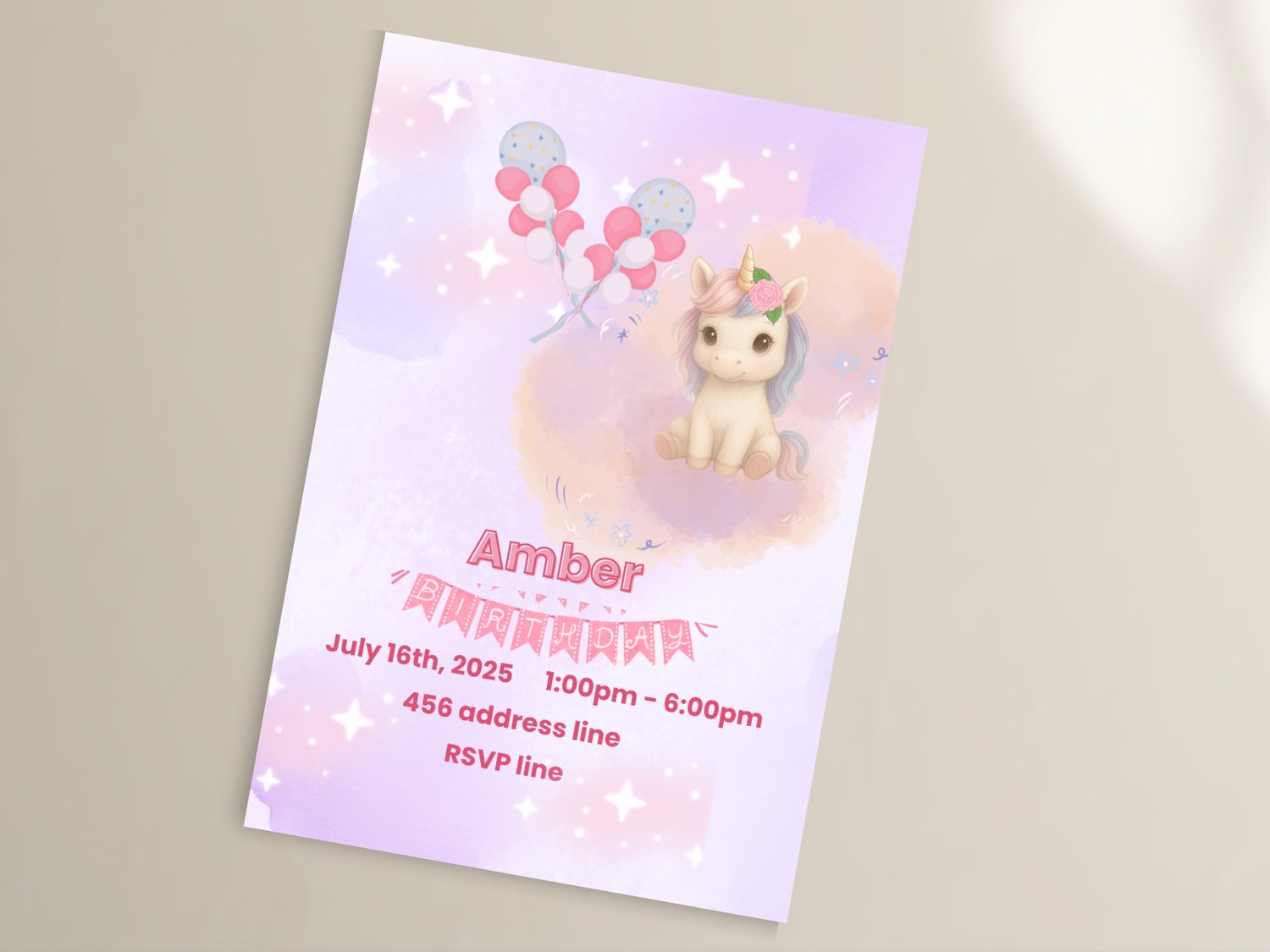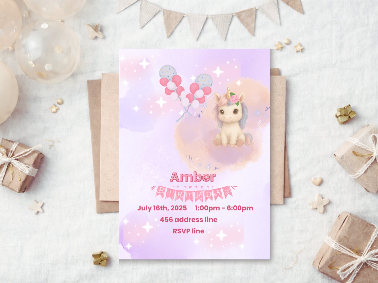 Unicorn Birthday Girl Invitation – Editable Canva Template
