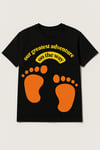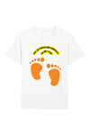 - Bold distressed orange baby footprints with a yellow retro arched banner and black lettering reading “our greatest adventure is on the way.”