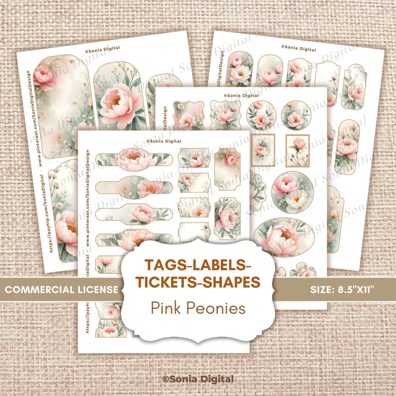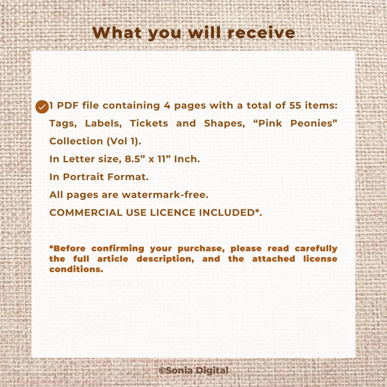 🔸4 x printable pages with a total of 55 items: Tags, Labels, Tickets and Shapes, “Pink Peonies” Collection (Vol 1). In Letter size 8.5”x11”. All pages are sold watermark-free. Commercial use license included*.