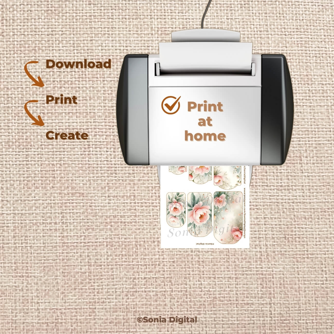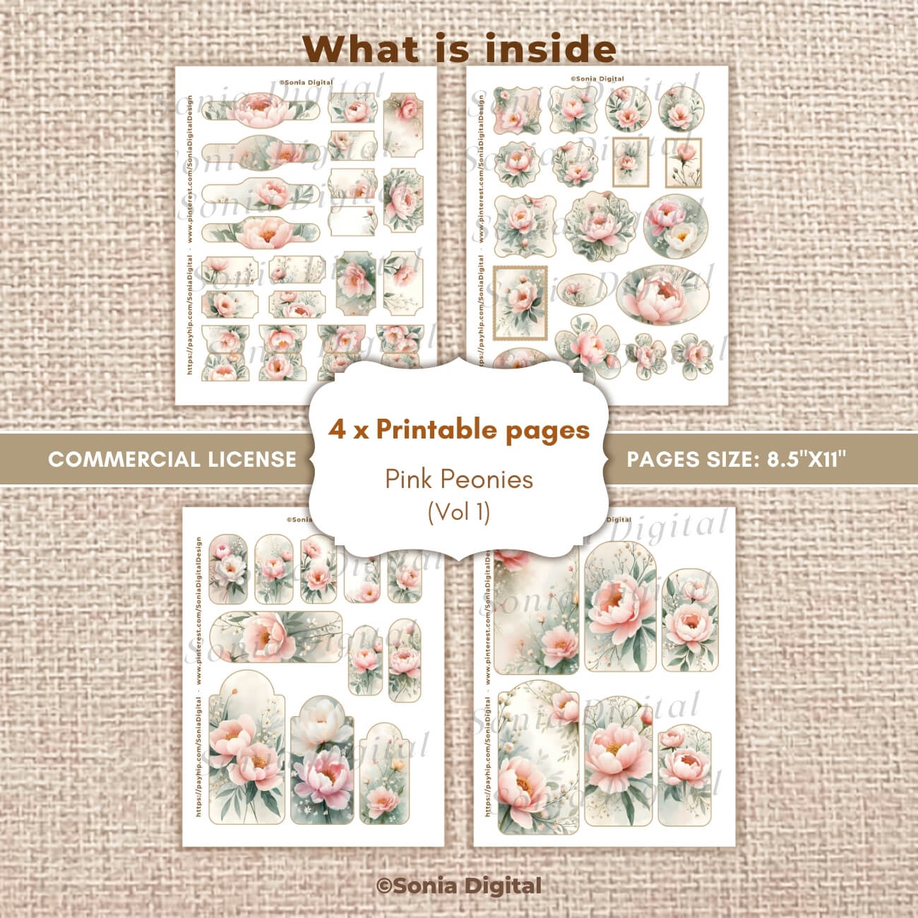 4 x printable pages containing Tags-Labels-Tickets-Shapes, “Pink Peonies” Collection (Vol 1), for Scrapbooking and Junk Journal creations. Letter size (8.5”x11”). Commercial use license included*