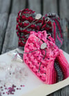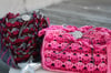 Construction is three easy pieces that are slip stitch seamed on the right side for function as well as aesthetic appeal. Further reinforced strength comes in the form of a double layer of stiff interfacing covered with a simple crochet fabric and placed in the bag’s bottom, because these fun bags are designed with no fabric lining required.