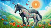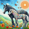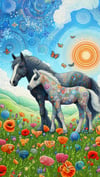 Beautiful black horse & white foal with spirograph patterns on green hills scattered with poppies & bluebells. There are butterflies & a spirograph sun & blue sky.