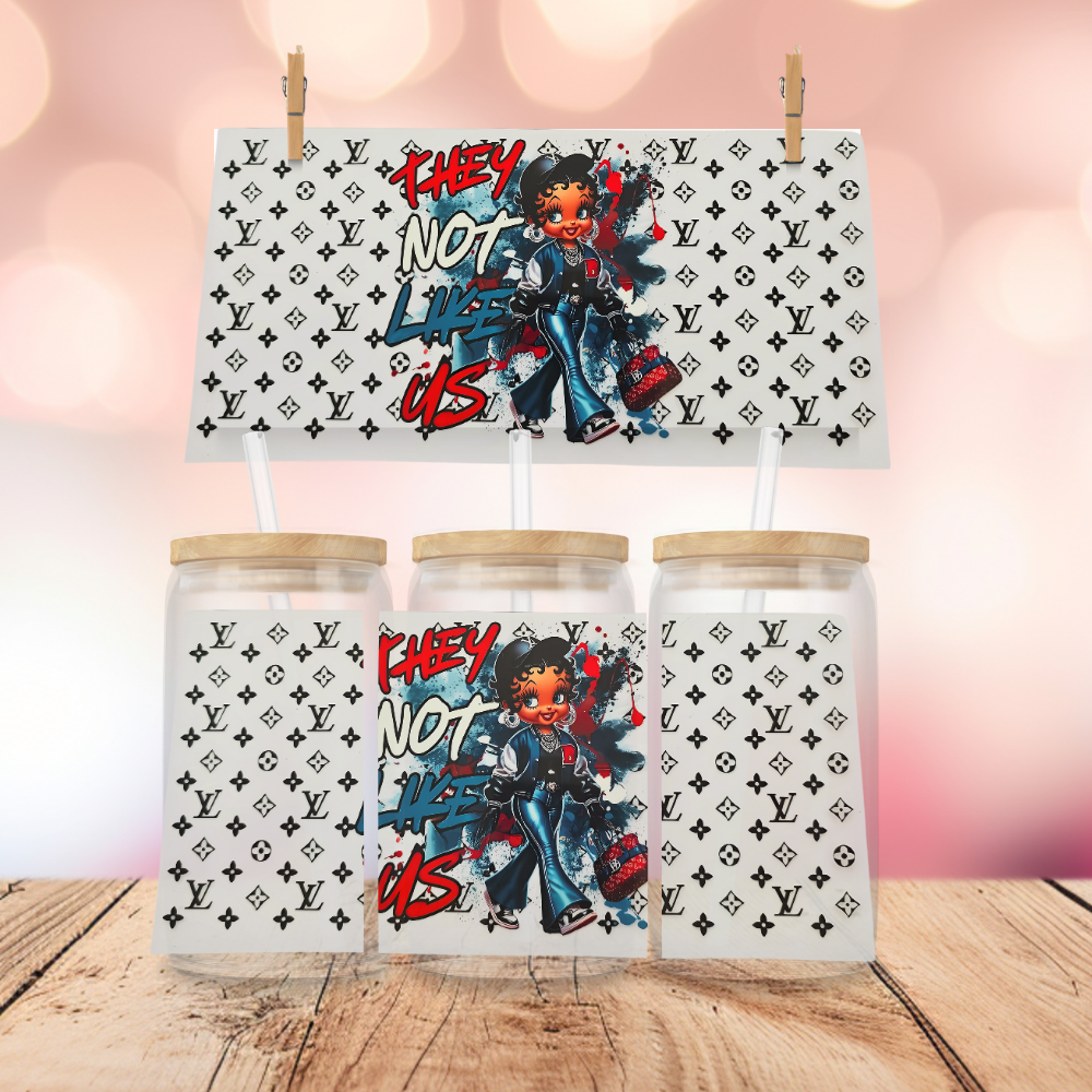 Let them know the vibe is different with the fierce Miss B βThey Not Like Usβ Wrap! This design features Miss B serving boss energy and unapologetic confidenceβstyled to perfection and made to stand out. Designed for 16 oz Libbey glass cups or tumblers, this wrap is for the trendsetters, the trailblazers, and the girls who know they're in a league of their own.