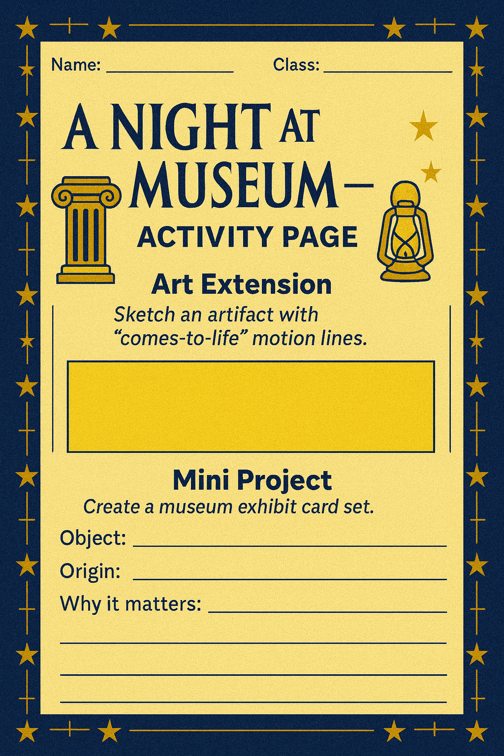 Bring history, imagination, and critical thinking into your classroom with this Night at the Museum – Film Friday Movie Guide Bundle. Designed for grades 6–12, this packet helps students analyze character motivation, plot structure, theme, and visual storytelling while engaging with a fun, adventure-filled movie that blends comedy with historical references.