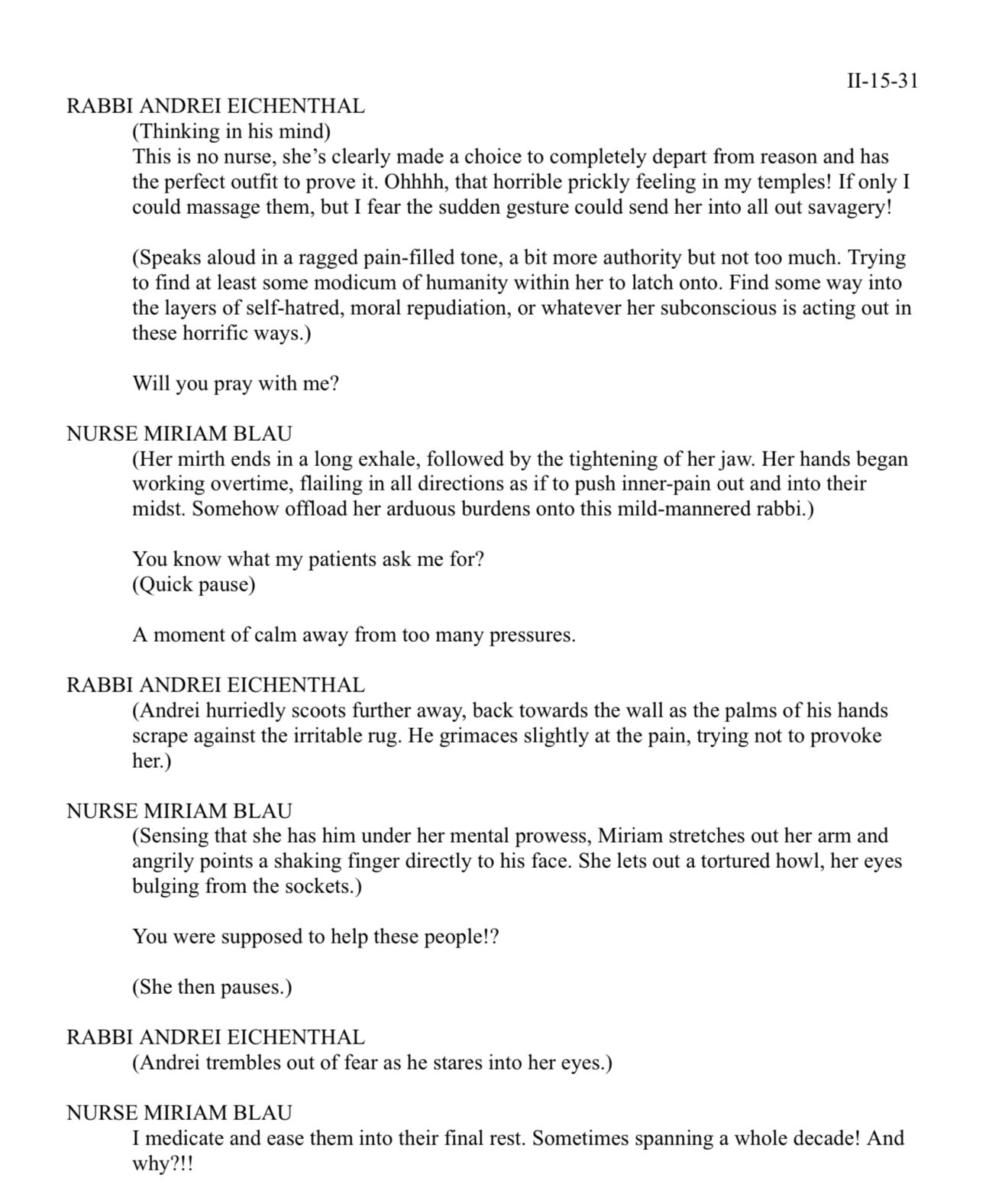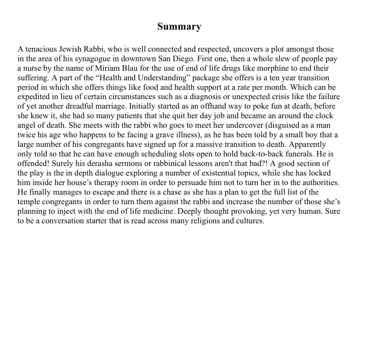 A tenacious Jewish Rabbi, who is well connected and respected, uncovers a plot amongst those in the area of his synagogue in downtown San Diego. First one, then a whole slew of people pay a nurse by the name of Miriam Blau for the use of end of life drugs like morphine to end their suffering. A part of the “Health and Understanding” package she offers is a ten year transition period in which she offers things like food and health support at a rate per month. Which can be expedited in lieu of certain circumstances such as a diagnosis or unexpected crisis like the failure of yet another dreadful marriage. Initially started as an offhand way to poke fun at death, before she knew it, she had so many patients that she quit her day job and became an around the clock angel of death. She meets with the rabbi who goes to meet her undercover (disguised as a man twice his age who happens to be facing a grave illness), as he has been told by a small boy that a large number of his congregants have signed up for a massive transition to death. Apparently only told so that he can have enough scheduling slots open to hold back-to-back funerals. He is offended! Surely his derasha sermons or rabbinical lessons aren't that bad?! A good section of the play is the in depth dialogue exploring a number of existential topics, while she has locked him inside her house’s therapy room in order to persuade him not to turn her in to the authorities. He finally manages to escape and there is a chase as she has a plan to get the full list of the temple congregants in order to turn them against the rabbi and increase the number of those she’s planning to inject with the end of life medicine. Deeply thought provoking, yet very human. Sure to be a conversation starter that is read across many religions and cultures.