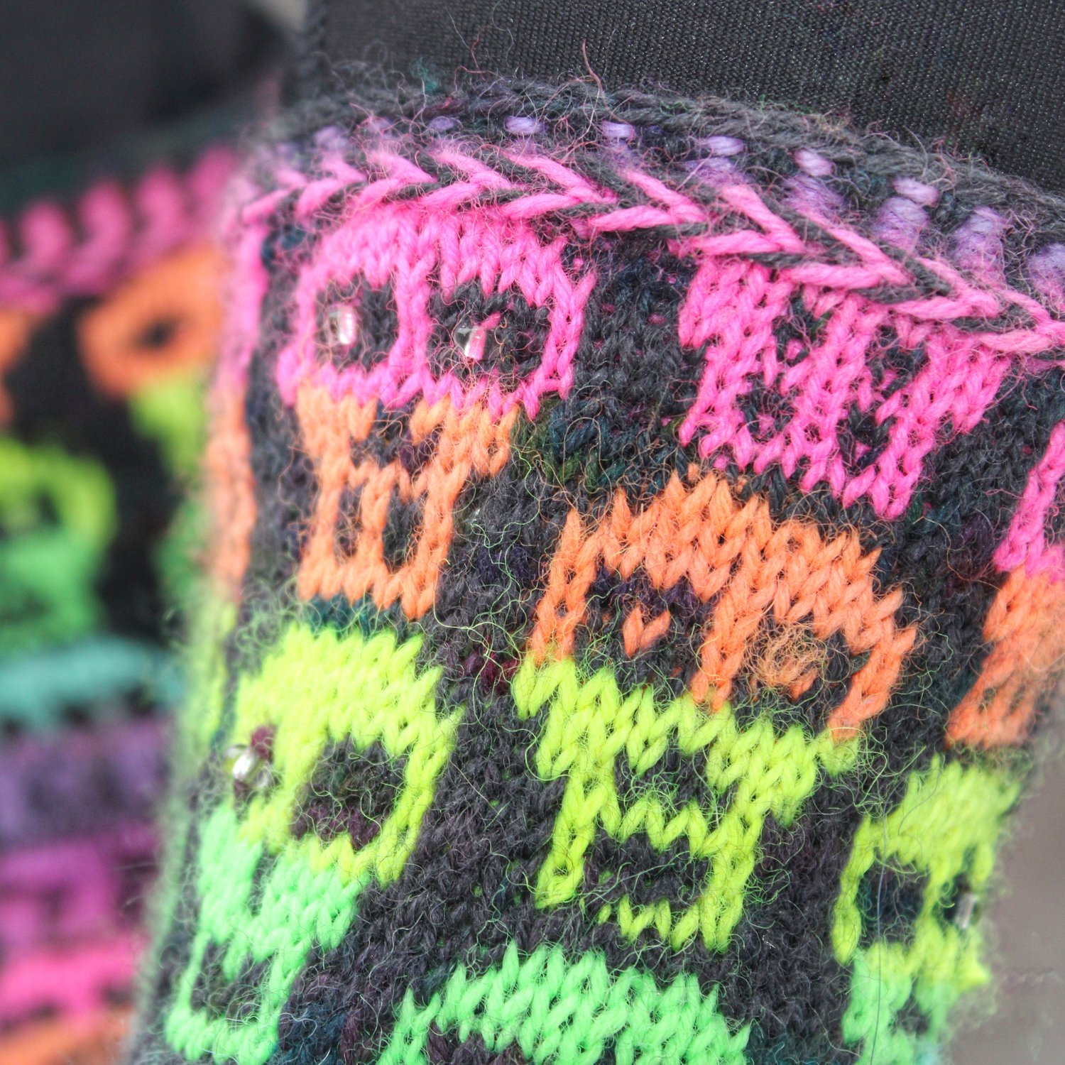 Embrace the chaos and magic of the dice to create your own unique gothic skull socks. These toe-up stranded knit socks weave together warmth and goth style with every stitch. Skulls hauntingly decorate the front. Whilst the back features a pinstripe pattern which adds extra stretch to the fabric and an optional gusset insert. The perfect socks to decorate your feet whether you are at a gig, exploring haunted places or just embracing your dark aesthetic.