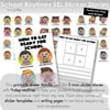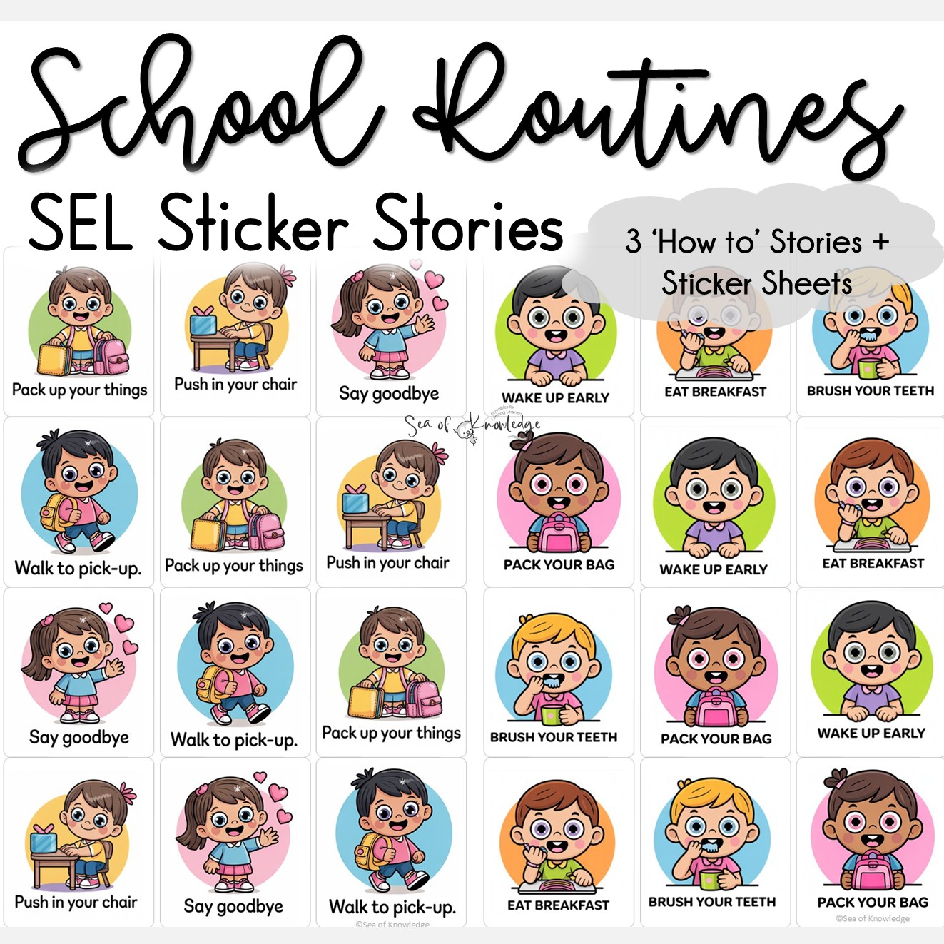 first week of school activities, preschool routines, kindergarten routines, back to school visuals, routine social stories, morning routine stickers, school routine sequencing, classroom management visuals, first week of kindergarten, preschool visual schedule, first week of school printables, school routine posters, daily routine activities, back to school sticker stories, SEL sticker routines