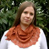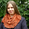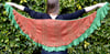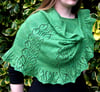 The shawl is available in two sizes. The large size is knit in Fyberspates Rural Charm BFL Silk Cashmere, in green and uses 760 yards of yarn, and the smaller size is Eden Cottage Yarns Titus 4ply, in orange and uses 437 yards.