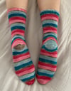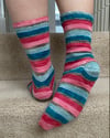 Yarn: Fingering weight; actual yarn usage will depend on size made and length of foot, though most people will be able to get a pair out of one 3.5 oz./100 g skein of sock yarn