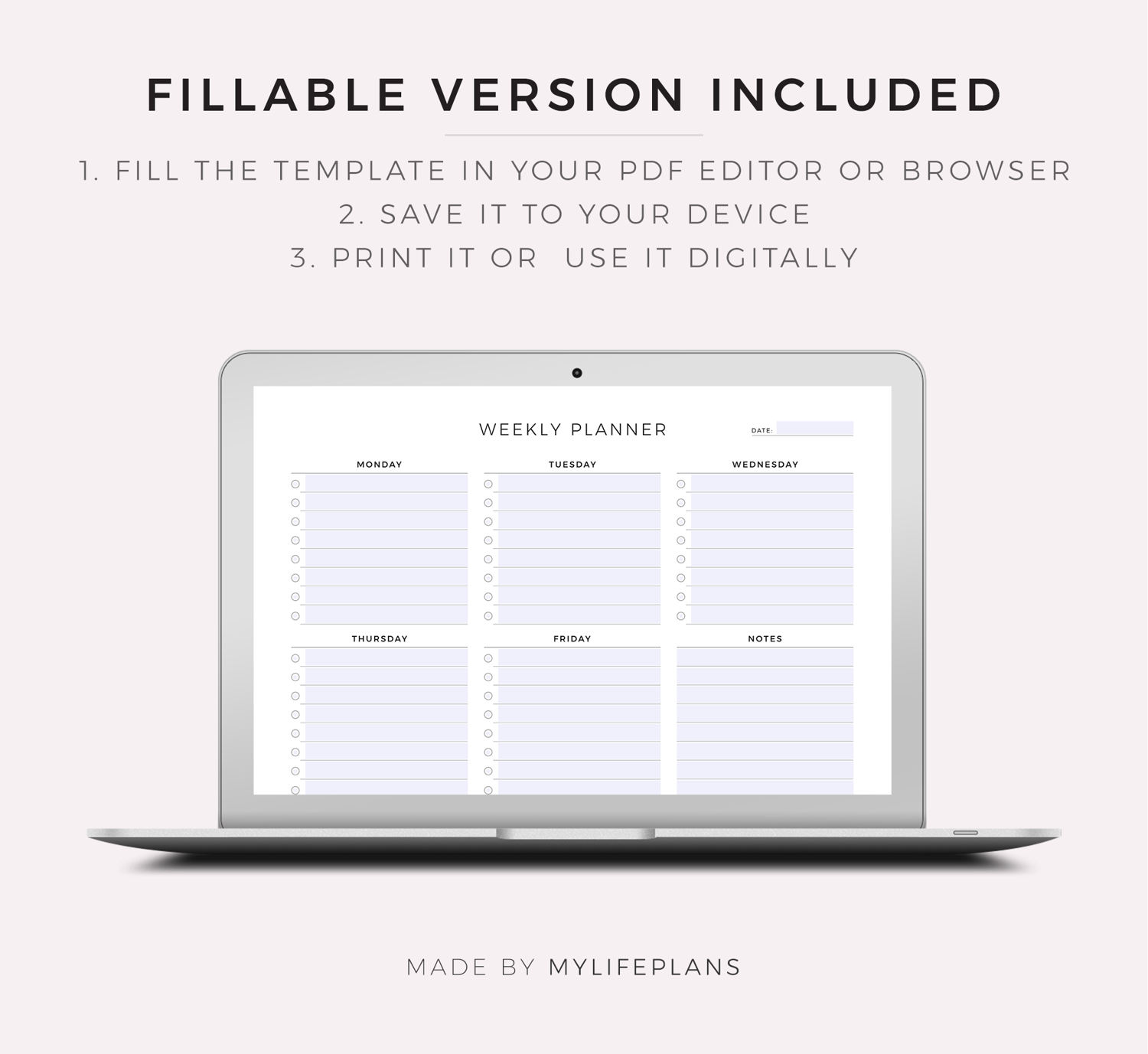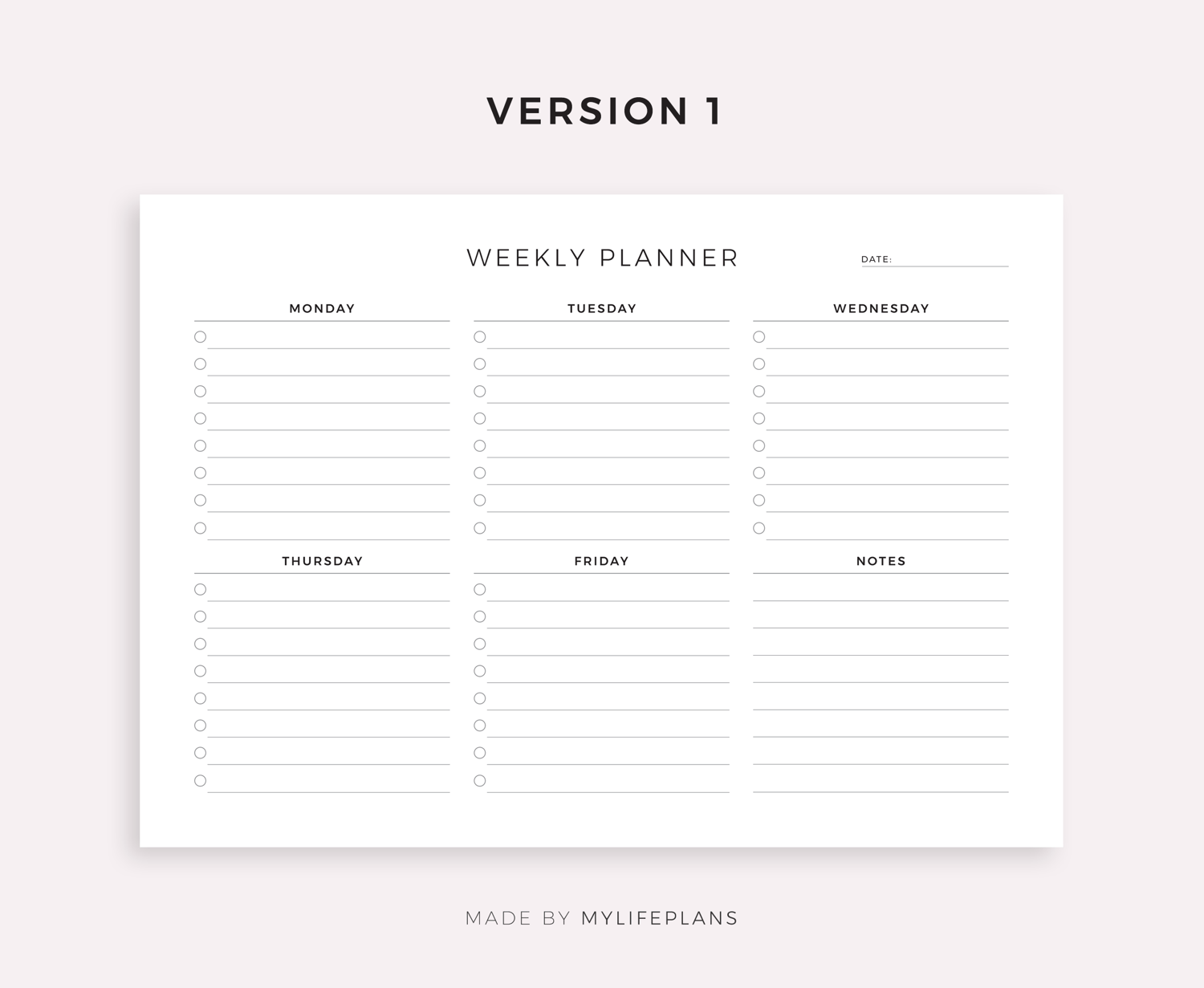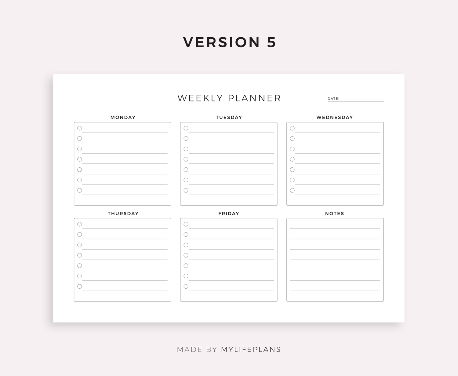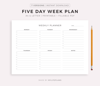 This is a printable five day week planner — just download, print, and start using it right away.