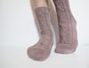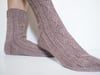 The socks are knitted top-down. They start with a portion of modified ribbing, then the cable and texture pattern is worked on the front of the leg. A round heel is then worked and the pattern is continued on the top of the foot, the sole being worked in stockinette stitch. A simple wedge toe is worked at the end in stockinette stitch.