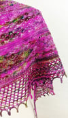 Fingering weight shawl is knit up in one skein of Miss Babs’ Yummy 2-Ply.