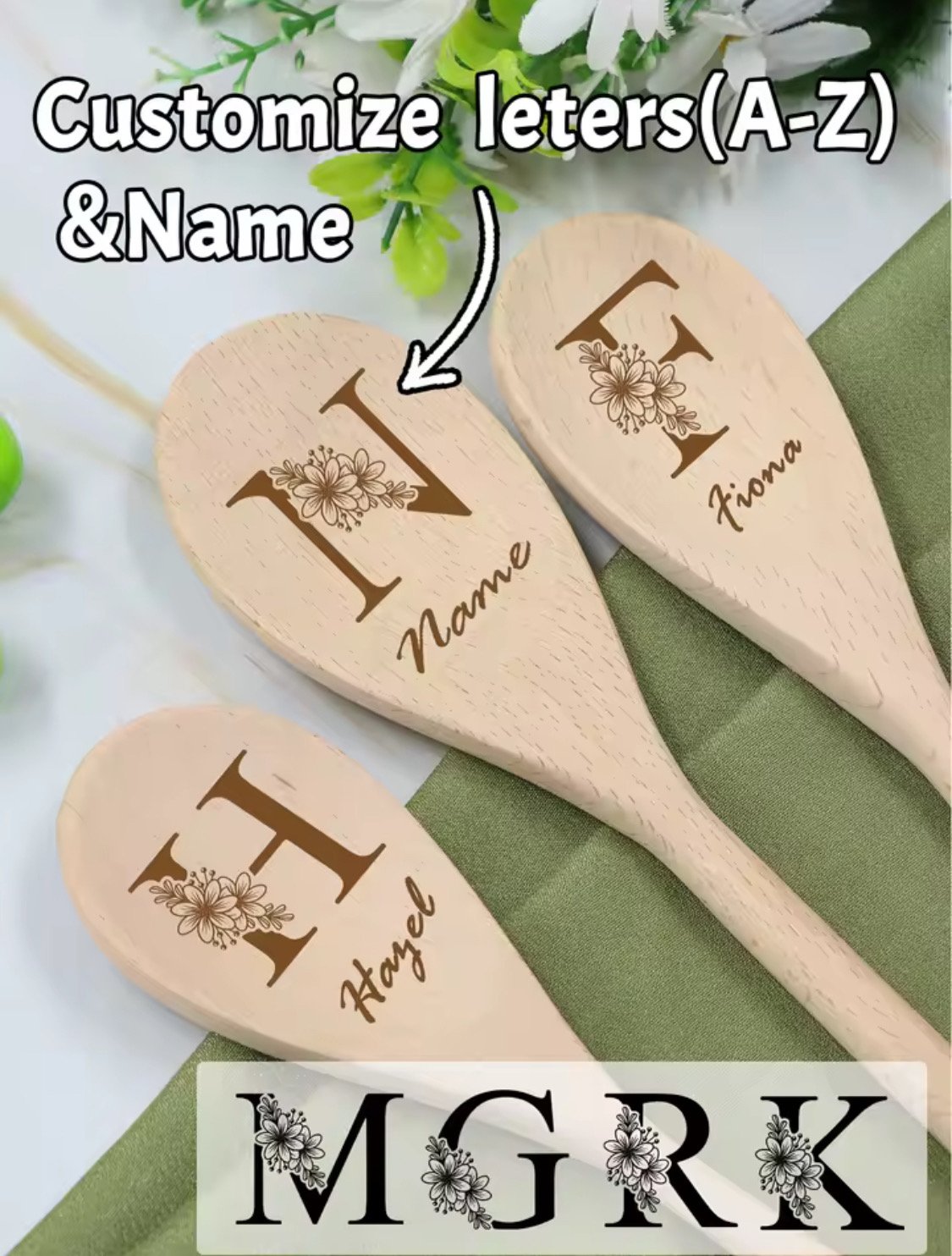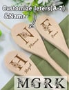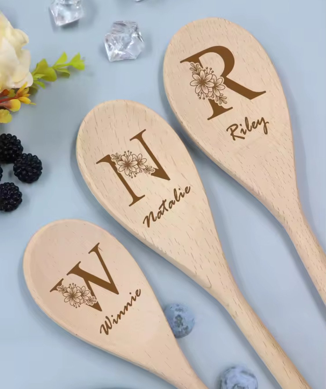 Add a personal touch to your kitchen or gift something truly special with this beautifully crafted 35cm wooden spoon. Each spoon features a delicate floral design, along with a custom engraving that includes an initial at the top and a name engraved below.