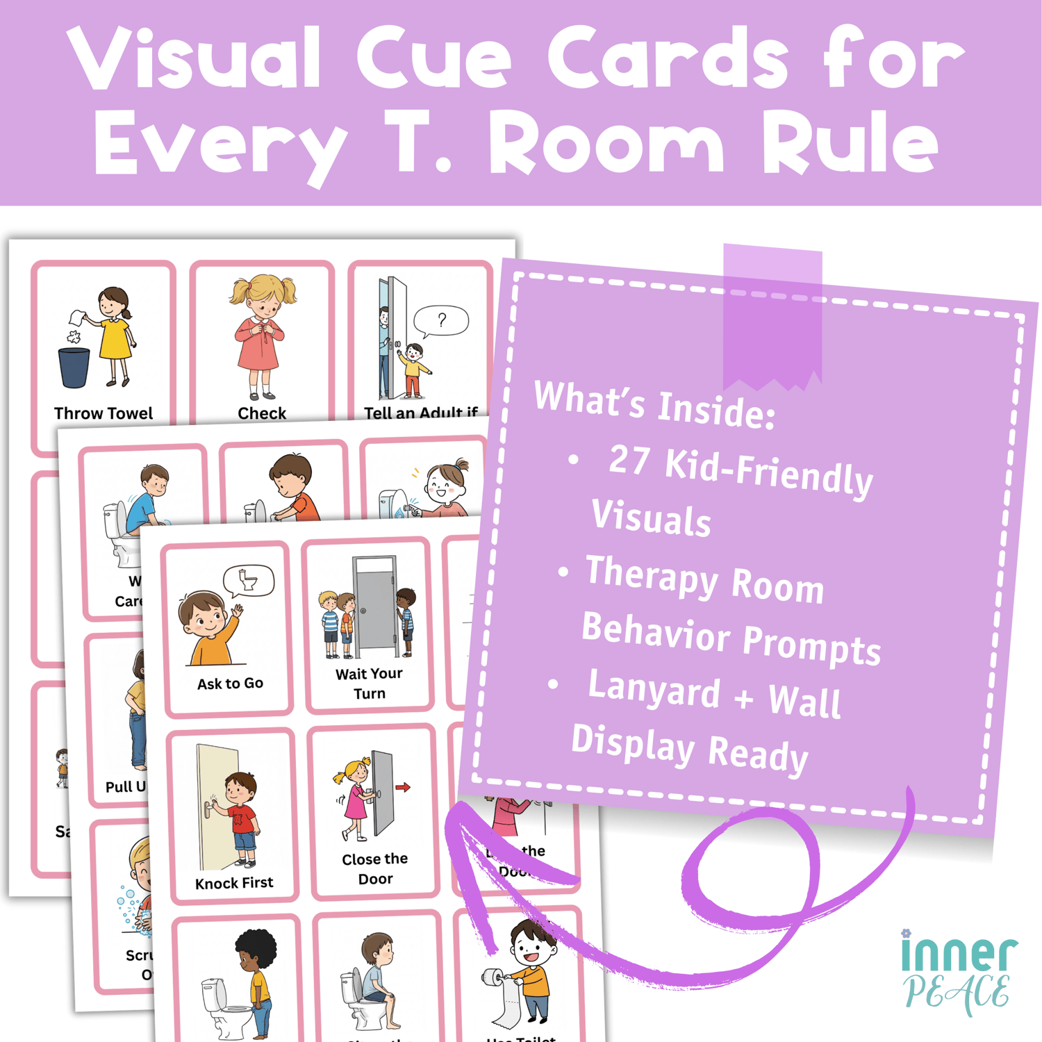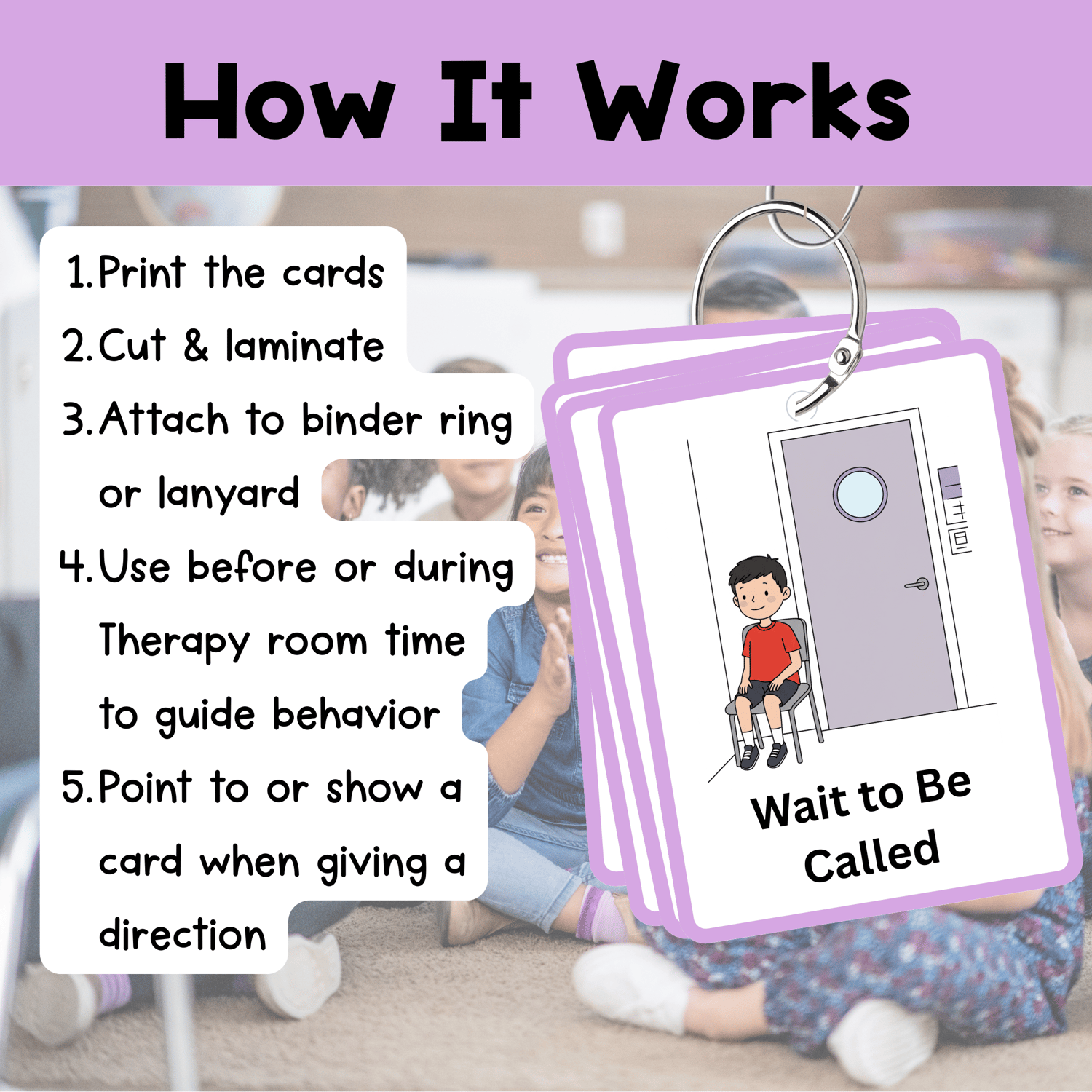 - 27 lanyard-sized visual cue cards for therapy room routines